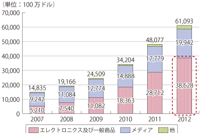 そういった中で、ネット通販で世界最大手のAmazonは、急激な成長を続けており2012年にはついに世界最大の家電量販店ベストバイの売上高を上回った(図表1-1-3-21)。この売上の伸びを大きく支えるのは、積極的な物流への設備投資(図表1-1-3-22)と、メディア(本・CD・DVD等)以外の商品の拡大であり、同社の売上構成をみると開業当初の中核だったメディア部門から、徐々にエレクトロニクス・一般商品に売上の主軸がシフトし2010年にメディアを上回っている(図表1-1-3-23)。このことは、同社の総資産と売上高の成長率が共に30%以上と、日米の主要小売企業と比較しても突出したスピードで投資と規模の拡大を行っている(図表1-1-3-24)ことからも浮かび上がり、多くの品揃えとその商品の配送を支える物流ネットワークが同社の事業拡大を支えている構図が見て取れる。