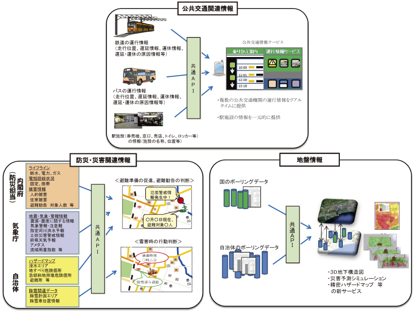 例えば、公共交通情報を活用した実証実験では、複数の鉄道やバスのリアルタイムな運行情報が活用可能となることで、複数の公共交通機関の電車やバスのリアルタイムな位置情報を1つの地図上で閲覧できるサービスや、実際の遅延情報を考慮した最適なルート案内等のサービス等が実現できることを検証している。また、防災・災害関連情報を活用した実証実験では、リアルタイムの様々な気象データと地方自治体が提供しているハザードマップ等の情報とを同じ地図上で組み合わせること(マッシュアップ)で、住民の避難や地方自治体の行政判断に役立てられるような情報の公開・利活用について検証している。なお、気象庁は、この実証実験において、気象データの提供に協力している。更に、地盤情報を活用した実証実験では、国や地方自治体が公共事業のために作成した地盤情報(ボーリングデータ)を二次利用しやすい形式で公開する仕組を実証し、それらを集積することで、3D地下構造図、災害予測シミュレーション等の様々なアプリケーションが実現できることを検証している(図表2-1-2-7)。