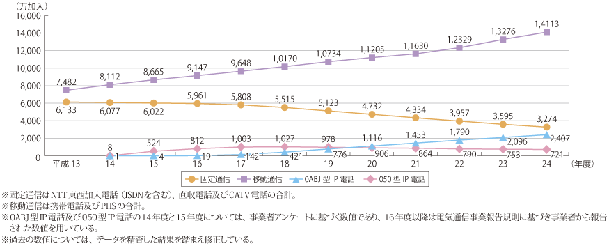 電話の加入契約数は、固定通信(NTT東西加入電話(ISDNを含む)、直収電話2及びCATV電話)及び050型IP電話が減少傾向にある一方、移動通信(携帯電話及びPHS)及び0ABJ型IP電話は堅調な伸びを示している。