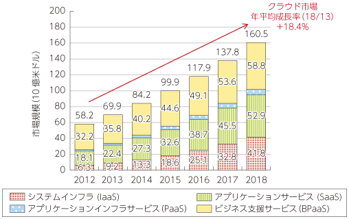 クラウドは、そのサービス範囲に応じて複数のモデルが提供されており、アプリケーションからハードウェアまでをクラウド化するSaaS(Software as a Service)、ミドルウェア〜ハードウェアまでのPaaS(Platform as a Service)、ハードウェアのみのIaaS(Infrastructure as a Service)、様々なビジネス・プロセスをクラウドサービスとして提供するBPaaS(Business Process as a Services)等に大別されるが9、これらの形態を含む法人向けクラウドサービスの世界市場は、2013年の約700億ドルから2018年には約1,600億ドルとなり、年平均18.4%と、図表2-2-1-2のICT全体の市場成長率3.4%と比べても極めて高い成長率で拡大していくことが予測されている(図表2-2-1-11)。