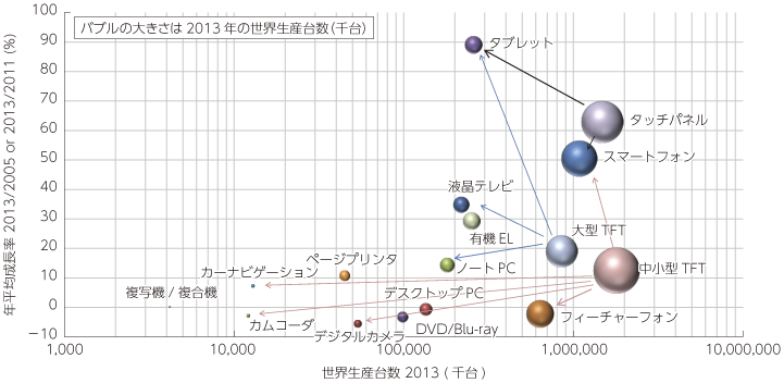 これら製品の世代交代に伴い、生産状況も変化しており、特に液晶ディスプレイは顕著である。例えば主に液晶テレビ、ノートPC、タブレットなどに使われる大型TFT、スマートフォン、フィーチャーフォン、デジタルカメラ、カーナビゲーションなどに使われる中小型TFT分野は、年平均成長率10%台で成長しており、特に後者は2013年で年間10億枚を超える規模で大量生産が進んでいる。また、主にスマートフォンやタブレット等に使用されるタッチパネルも主力製品となっており、成長率や規模を見ても両製品の近辺にあり、年平均成長率が60%を超え急速に存在感を増すまでに至っている。