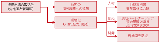 「成長市場の取り込み」については、「顧客の海外展開への追随」と「現地化」という大きく二つの要素があげられる。