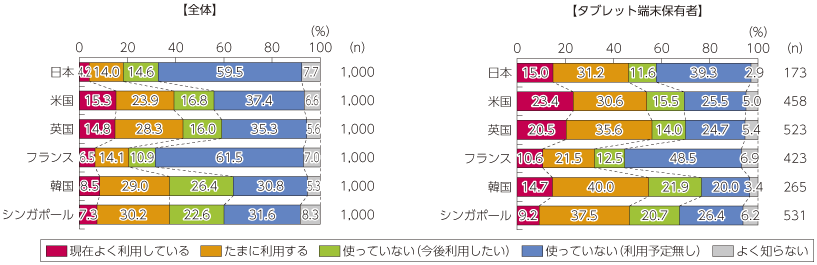 また、図表4-1-1-17でも述べたようにタブレット端末における利用率が高かった電子書籍については、我が国の「電子書籍」の利用率は2割弱である一方、今後利用したいという回答は約15%あり、これを合わせた電子書籍の利用に積極的な回答では3割を超えている。他国においてはフランスを除く4か国で現状でも利用率が3割を超えており、我が国以上に電子書籍が浸透している状況にある。