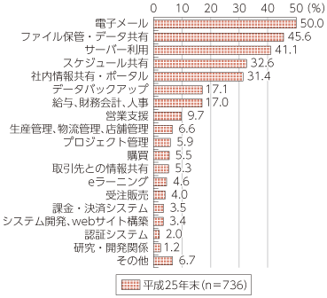 利用しているサービスをみると、「電子メール」が50.0%と最も高く、次いで「ファイル保管・データ共有」(45.6%)、「サーバー利用」(41.1%)となっている(図表5-4-1-3)。