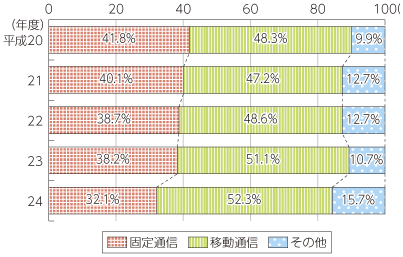 平成24年度における電気通信事業の売上高は、12兆9,551億円(前年度比2.4%減)となっている(図表5-5-1-1)。