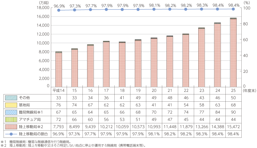 平成25年度末における無線局数(PHSや無線LAN端末等の免許を要しない無線局を除く)は、1億5,724万局(対前年度比7.5%増)、うち携帯電話端末等の陸上移動局は1億5,472万局(対前年度比7.5%増)となっており、総無線局数に占める携帯電話端末等の陸上移動局の割合は、98.4%と高い水準になっている。また、簡易無線局についても90万局(対前年度比7.9%)に増加している(図表5-7-1-2)。