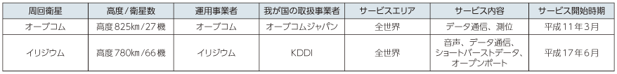 周回衛星は、静止軌道以外の軌道を周回するもので、一般に静止軌道よりも近い距離を周回している。このため、静止衛星に比べて伝送遅延が小さく、また、衛星までの距離が近いため、端末の出力も小さくて済み、小型化や携帯化が可能であり、主に移動通信に用いられている。一方、衛星は、上空を短時間で移動してしまうため、通信可能時間を確保するため、また、広域をカバーするためには、多数の衛星の同時運用が必要となる(図表5-7-1-4)。
