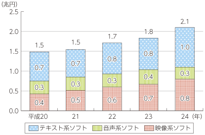 コンテンツ市場のうち、パソコンや携帯電話向けなどインターネット等を経由した通信系コンテンツの市場規模は2兆1,210億円となった。ソフト形態別の市場構成比では、テキスト系が46.5%、映像系が37.5%、音声系が16.0%を占める。