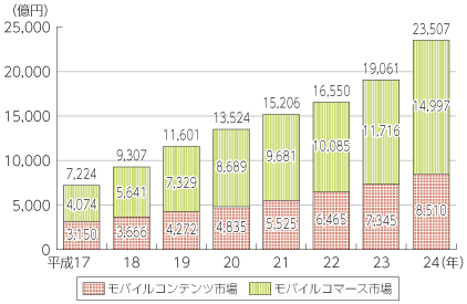 モバイルコンテンツ市場5とモバイルコマース市場からなる我が国のモバイルコンテンツ産業の市場規模6は、スマートフォンやタブレット端末の普及・進展等により、平成24年で2兆3,507億円(前年比23.3%増)となっており、引き続き増加している(図表5-8-1-9)。この内訳を市場別にみると、モバイルコンテンツ市場が8,510億円(前年比15.9%増)、モバイルコマース市場が1兆4,997億円(前年比28.0%増)となっている。