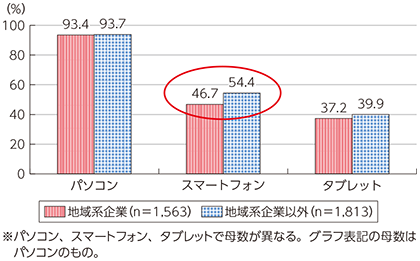 次にパソコン等のICT端末の企業での導入状況をみてみた。パソコンの導入率はいずれも9割を超え、企業タイプによる差はみられなかった。スマートフォン、タブレットの導入率は地域系企業以外の方がやや高く、特にスマートフォンでは地域系企業と地域系企業以外との間に8ポイント弱の差があった(図表3-1-2-3)。