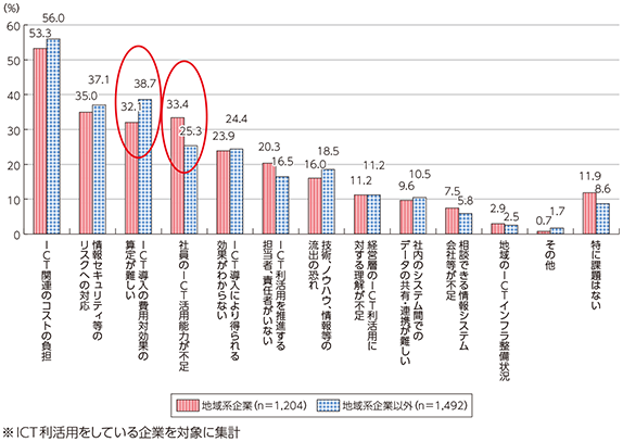 最後に、ICTを利活用する上での課題を比較した。地域系企業では「社員のICT活用能力が不足」が高いのに対し、地域系企業以外では「ICT導入の費用対効果の算定が難しい」が高いのが特徴的である。それ以外については大きな傾向の違いはみられなかった。「ICT関連のコスト負担」と「情報セキュリティ等のリスクへの対応」は企業タイプによらず共通の課題となっている(図表3-1-2-13)。