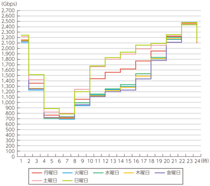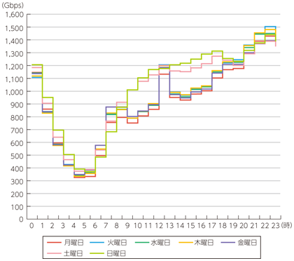 ISP6社のブロードバンド契約者の時間帯別トラヒックの曜日別変化をみると、22時から23時がピークの時間帯となっており、休日は朝から昼にかけて急激に増加し、その後夕方にかけて微増している(図表7-2-2-34)。