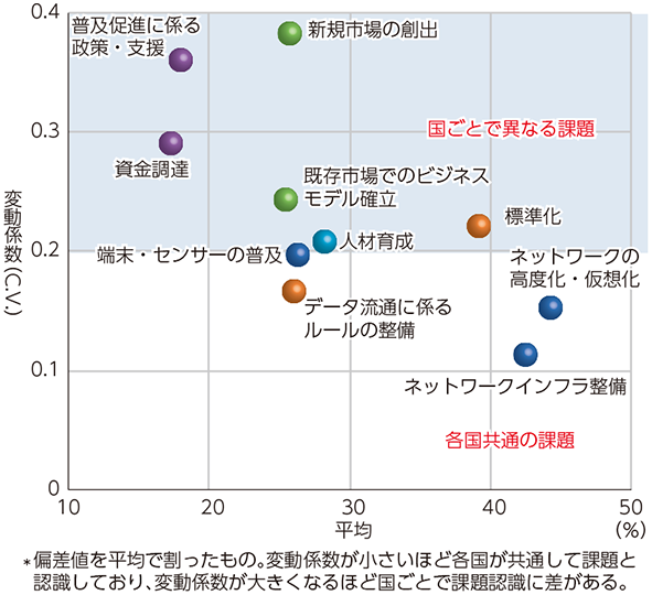 - IoTの進展に係る課題についての国際企業アンケート(日、米、英、独、韓、中)結果として、日本はインフラ面については他国と比較して課題と感じている企業が少ない一方、人材育成を課題と感じている企業が多い。