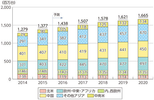 現在のハンドセットの代表的製品であるスマートフォンの市場は、中国以外のアジア諸国(ASEAN等)、中南米、アフリカが市場のけん引役になっている。中国やインドなどの巨大市場で出荷の伸びは鈍化傾向にあり、特に中国では需要の一巡と供給過多が発生し、2015年以降新規需要は急速にスローダウンした。現在、スマートフォン市場が立ち上がっているインドもインフラの遅れや端末価格が一般ユーザーにとって高額であることから伸び悩んでいる。主要市場では需要が一巡、今後は買い替え需要に移行し、2020年には16億台に達すると予想されている(図表2-2-5-1、図表2-2-5-2)。