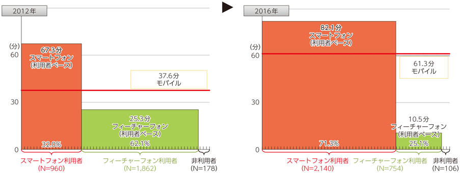 モバイルからのインターネット利用時間が2012年から2016年にかけ増加した要因を、スマートフォン利用者のインターネット利用時間、フィーチャーフォン利用者のインターネット利用時間、各機器の利用率に分けてみると、スマートフォン利用者1人あたりの利用時間も増加しているが、スマートフォン利用者の割合が上昇した影響が大きい。フィーチャーフォンの利用者がスマートフォン利用に移行することにより、インターネット利用時間が増加してきたことがうかがえる。