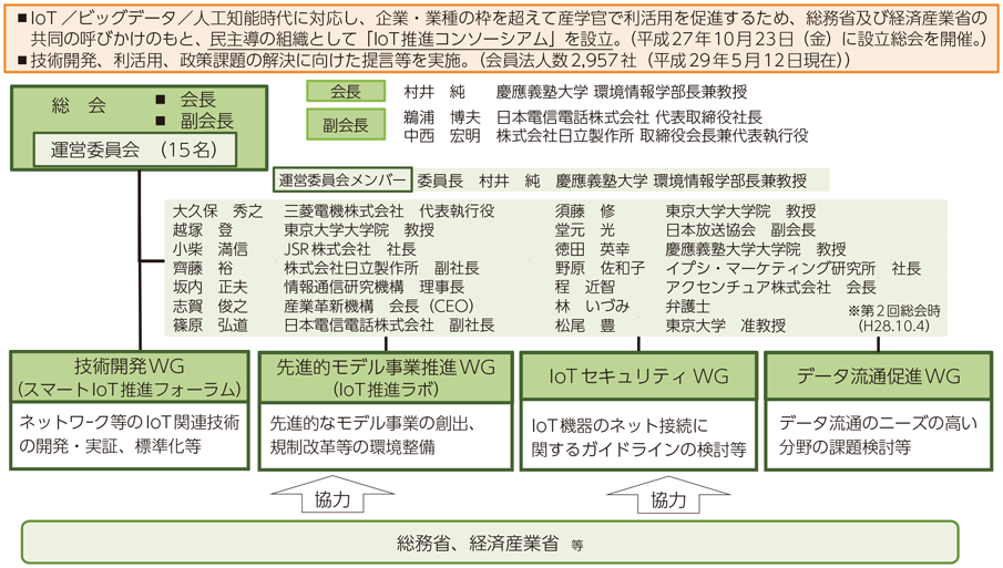 IoT/ビッグデータ/AI等の発展による世界的な産業構造の変革にあたって、産学官が参画・連携し、IoT推進に関する技術の開発・実証や新たなビジネスモデルの創出推進するための体制を構築することを目的として平成27年10月に「IoT推進コンソーシアム」が設立された(図表7-1-2-3)。
