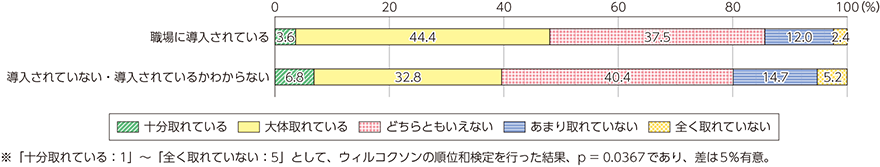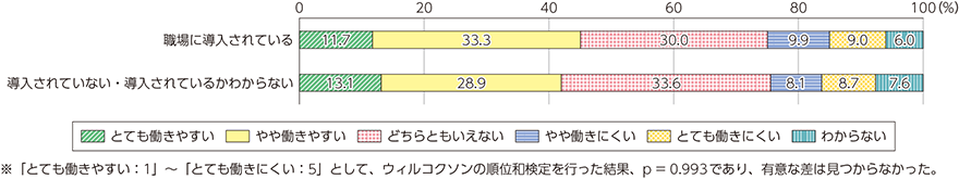職場での働きやすさについては、ビジネスICTツールの職場への導入の有無と、働きやすさとの関係は統計的に有意差が認められなかったことから、導入だけでは働きやすさとの関係は窺えなかった(図表4-4-2-5)。