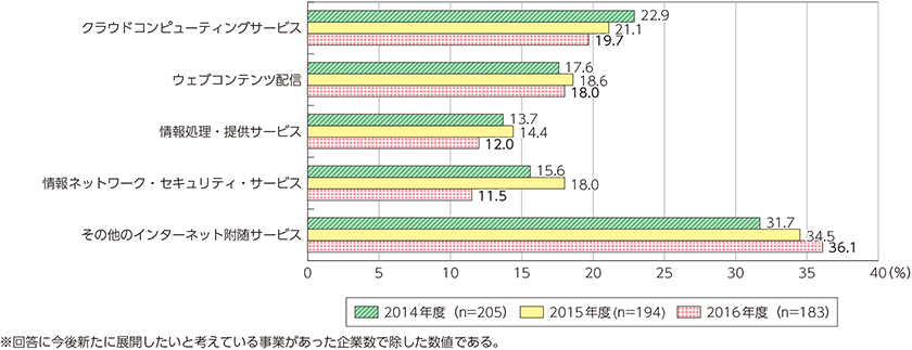 今後新たに展開したいと考えている事業分野について、回答企業の割合が大きかったものは「クラウドコンピューティングサービス」が19.7%(前年度差1.4ポイント低下)、「ウェブコンテンツ配信」が18.0%(前年度差0.6ポイント低下)、「情報ネットワーク・セキュリティ・サービス」が11.5%(前年度差6.5ポイント低下)となっている。(図表5-1-5-11)。
