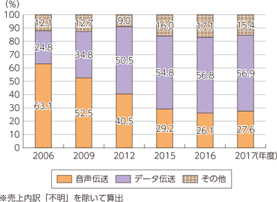固定通信34と移動通信35の売上比率は、固定通信の割合が32.4%、移動通信が52.2%となっている(図表3-1-7-2)。また、売上高の役務別比率をみると、音声伝送役務の割合が全体の27.6%であり、データ伝送役務は56.9%となっている(図表3-1-7-3)。