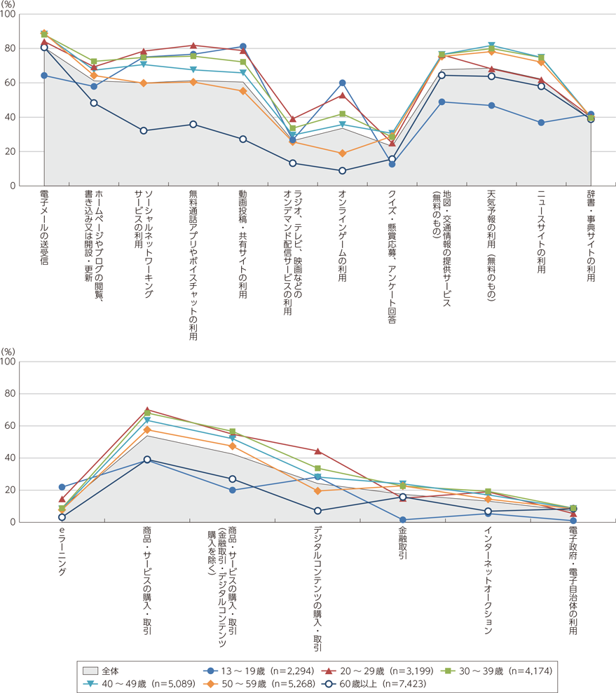 インターネットの利用目的については、「電子メールの送受信」がほぼすべての年齢層で高くなっている一方、「ソーシャルネットワーキングサービスの利用」や「動画投稿・共有サイトの利用」では各年齢階層の差が大きくなっている(図表3-2-1-8)。このうち、「ソーシャルネットワーキングサービスの利用」については、80歳以上を除く各年齢階層で利用率が上昇している(図表3-2-1-9)。