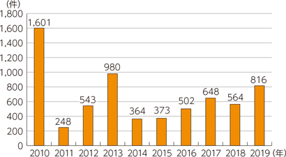 2019年中の不正アクセス行為の禁止等に関する法律(以下「不正アクセス禁止法」という。)違反事件の検挙件数は816件であり、前年と比べ252件増加した(図表5-2-1-15)。