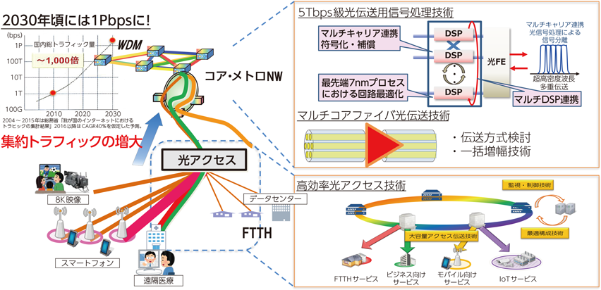 2020年(令和2年)以降、5G普及による高精細動画の携帯端末への配信、8Kコンテンツのインターネット配信、遠隔医療、IoT機器等からのデータ収集、AI活用のためのビッグデータ流通、自動運転のための情報の送受等のネットワークと連携したサービスの普及により、データトラフィックが爆発的に増大し、ネットワーク全体の通信容量がひっ迫することが指摘されている。これまで研究開発を行ってきた現行技術のみによる基幹網の大容量化は限界に近づきつつあり、現行技術でさらなる大容量化に対処する場合には、光ケーブル・送受信器等の増設及びそれに伴う電力・設置空間・コストの増大が課題となっている。