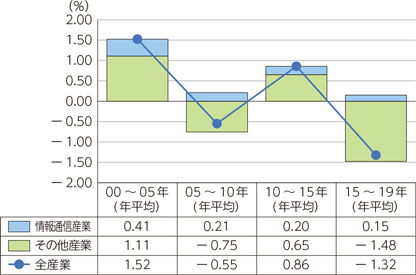 図表1-2-1-6は情報通信産業とその他の産業の労働生産性寄与度の推移を5年ごと(2015-19年のみ4年)の期間で示したものである。産業全体の労働生産性向上に対する情報通信産業の寄与度は、いずれの期間においてもプラス値を維持している。