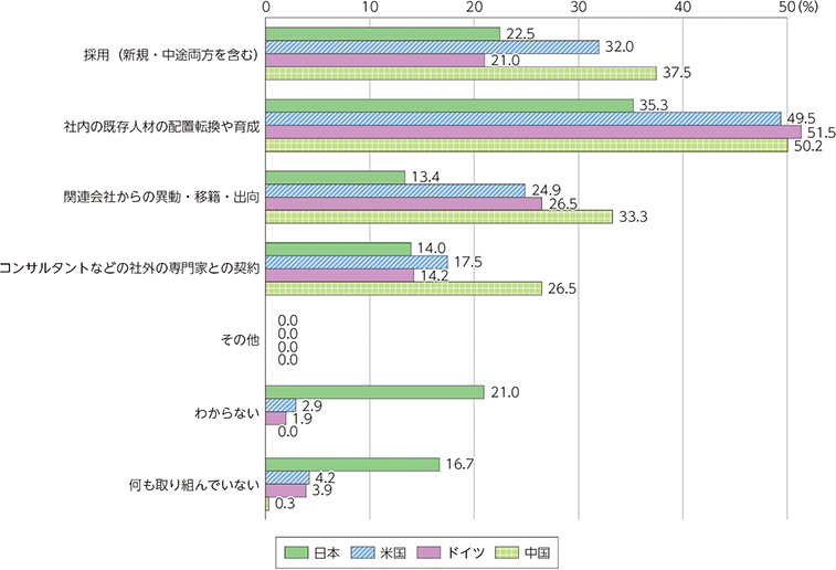 「デジタル人材の確保に向けた取組状況(国別・デジタル人材と事業部門の人材を融合させ、DXに取り組み体制を構築できる人材)」の