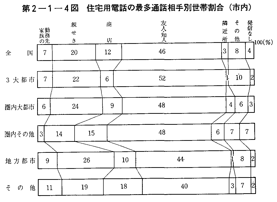 1 住宅用電話の増加とその利用動向電話の加入状況をみると,近年,住宅用電話の増加がめざましい。第2-1-1図は,昭和40年度以降における電話加入数(住宅用,事務用)の推移を示したものであるが,住宅用電話の増加の伸びが特に著しく,40年度及び47年度の両年度について年度末の加入数を比較すると,住宅用電話の場合47年度は40年度の約6、0倍となり,事務用電話の約1.8倍を大きく上回っている。また,こうした住宅用電話の増勢を反映して,住宅用電話の一般加入電話加入数に占める割合も年々増加しており,40年度末の25.3%から46年度末には49.8%となり,住宅用電話と事務用電話の加入数がほぼ等しくなった。更に47年度末においては,加入数2,098万のうち住宅用電話が54.2%に当たる1,137万を占めることにより,事務用電話をはじめて若干上回る結果となった。住宅用電話がこのように飛躍的な増加を示したのは,40年代に入って住宅用電話に対する需要が急速に高まったことによるが,その背景には,電話網の整備,とりわけダイヤル自動即時網の全国的普及によって通話サービスが一段と改善され,電話が非常に便利になったことのほかに,国民の所得水準の上昇とこれに伴う生活利便の確保に対する欲求の増大によって,電話は必需品であるとする認識が国民の間に定着してきたことなどの諸事情の変化があげられる。この傾向は,最近における生活行動圏の拡大,核家族化の進展等国民の生活態様の変化と相まって,今後とも一層促進されよう。 このような電話の加入構造の変化は,これまでのビジネス中心の電話の利用から,シビルミニマムとして市民生活の上でも多くの人が電話を利用するようになってきていることを意味している。 (1) 発信者及び通話相手の構成 郵政省総合情報流通調査会が47年度に行った実態調査によれば,電話(事務用電話を含む。)の発信者別利用状況は,第2-1-2図のとおりである。すなわち,性別にみると1日1人当たり男性は約6分であるのに対し,女性は約1.4倍の8.5分であり,年代別では20代及び30代が圧倒的に多い。また,職業別にみると,自営業,自由業,事務職が多く,農林水産業が少ない。次に住宅用電話について,電電公社が47年度に行った「住宅用電話利用実態調査」により発信者,通話相手の構成をみると,次のとおりである。 発信者のなかで電話を最も使うのは主婦である。最も多く電話をかけたものは主婦であると答えた世帯が全体の55%で最も多く,次いで世帯主,子供となっている(第2-1-3図参照)。ちなみに,46年度調査(東京,大阪両生活圏について実施)においても,主婦が発着信通話量全体のほぼ50%を占めており,主婦が住宅用電話の利用の中心となっている。 更に,最も多くかけている通話相手をみると,「市内通話」と「市外通話」とでは,その通話相手にかなりの違いがある。すなわち,「市内通話」の場合,「友人・知人」に最も多くかけたとする世帯が全体の46%を占め最も多いのに対し, 「市外通話」の場合,通話相手として「親せき」をあげる世帯が全体の51%と最も多い。また,これを地域別にみると,「市内通話」の場合,「友人・知人」とする世帯が「3大都市」, 「圏内大都市」及び「圏内その他」の3大生活圏において過半数を占め,「地方都市」,「その他」に比べて高い比率を示している。 これに対して「市外通話」の場合,「親せき」とする世帯の比率が上記3大生活圏よりも「地方都市」,「その他」において高く,「市内通話」の場合と対照的で,電話利用の地域的特性がみられる(第2-1-4図及び第2-1-5図参照)。 (2) 通話内容 最もよくかけた通話内容は,「市内通話」の場合,「レジャー・趣味・雑談」をあげた世帯が全体の27%と最も多いが,「3大都市」においては34%,「その他」では21%と地域によりかなりの差がある(第2-1-6図参照)。一方,「市外通話」の場合は「近況報告」をあげた世帯が全体の41%で最も多い(第2-1-7図参照)。また,通話内容を勤務先・取引先との連絡,出前・修理の依碩・買物,冠婚葬祭・突発事故など「義務的必需的性格の強い通話」と,レジャー・趣味・雑談,近況報告,勉強・教育など「自発的任意的性格の強い通話」に大別すると,「市内通話」の場合38対51,「市外通話」の場合19対55で,いずれも後者をあげる世帯が多い。 次に,発信者と通話内容との関連(「市内通話」の場合)をみると,世帯主が最多発信者であるとする層では「勤務先・取引先との連絡]をあげる世帯の比率が,また,子供が最多発信者であるとする層では「勉強・教育」,「レジャー・趣味・雑談」をあげる世帯の比率が他の層よりきわだって多くなっている。また,主婦が最多発信者であるとする層では「買物」,「レジャー・趣味・雑談」及び「近況報告」をあげる世帯が多いが,しかしながら他の最多発発信者の場合と比較してさほど顕著ではない。これは,主婦の通話内容が広く分散しているためと考えられる。 電話の利用実態は以上みたとおりであるが,住宅用電話における主婦の中心的存在,友人・知人・親せきとのひんぱんな通話,子供による勉強,雑談等の通話,そ