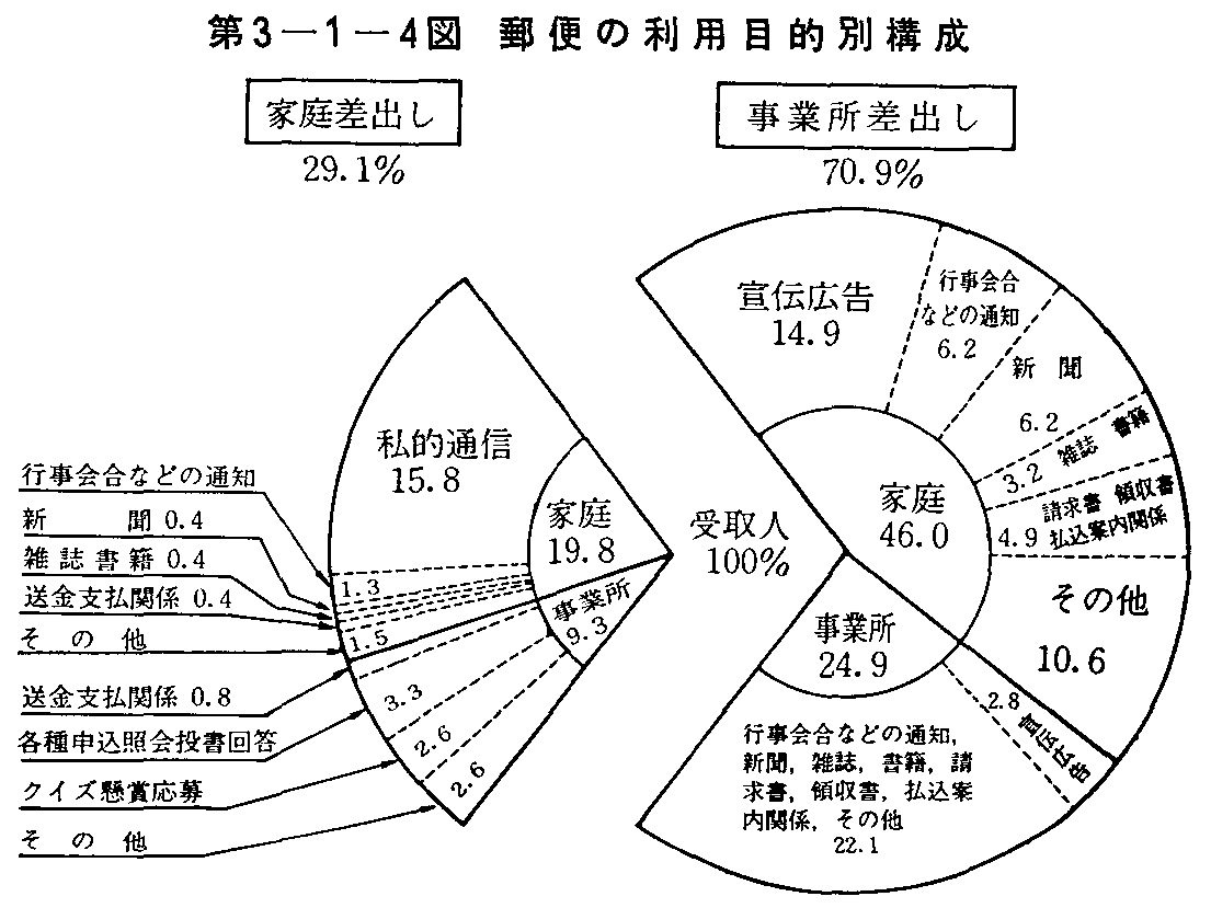 2 郵便物の流れと利用構造(1) 地域間交流状況全国各地で差し出された郵便物はどのようなところにあてられているのだろうか。 郵政省では3年ごとにあて地別の物数調査を行っているが,最近では45年9月に行った。これによると,我が国の郵便物の地域間交流状況は次のような傾向を示している。 ア.郵便物は近距離にあてられたものが多い。 郵便物は,その大半(全国平均57%)が引き受けられた都道府県(以下「県」という。)内で配達されており,しかもそのうちの約3分の1は引き受けられた郵便局で配達されている。 また,この割合は過去の調査結果と対比してみると,徐々に増大する傾向にある(第3-1-2図参照)。 もう少し細かくみると,大都市及びその近接県は総じて自県あての割合が低く,逆に地方県においては高い傾向にある。特に奈良県,東京都23区,大阪市における自県あての割合はそれぞれ40%,44%,49%で全国の最低位にあり,これに対し,北海道,高知県がそれぞれ85%,73%と最高位を示している。 イ.郵便物は,大都市では引き受けが配達より多い。 配達郵便物数と引受郵便物数の比をみると,東京都23区,大阪市,名古屋市,京都市,札幌市,仙台市,広島市,福岡市においては,引受郵便物が配達郵便物を上回っているが,他の地域においてはすべて配達郵便物が引受郵便物を上回っている。 ウ.郵便物は東京都から来るものが多い。 配達郵便物についてみると,通常郵便物においては,自県内で引き受けられたものが最も多い。他県から入ってくるものの割合をみると,東京都と兵庫県を除くすべての県において東京都からの郵便物が第1順位となっており,東京都の比重は非常に大きい。 なお,東京都と兵庫県は大阪府からの郵便物が第1順位である。 エ.郵便物は東京都にあてられたものが多い。 ア.で述べたように引受郵便物の約6割は自県あてであるが,他県あてのものの主要あて地は大部分が大都市及び近接県となっている。 他県にあてられた郵便物をあて地別にみると,46都道府県中38県が東京都を第1順位としており,他県から東京都にあてられた郵便物は,全国の他県あて郵便物数の17.4%を占め,東京都から東京都へあてたものを含めて東京都には全国で差し出された郵便物の約20.6%が集中している。 残り8県の第1順位をみると,京都府,兵庫,奈良,和歌山の各県は大阪府,東京都は神奈川県,岐阜県は愛知県,香川県は愛媛県,佐賀県は福岡県である。 第2,第3順位をみると近接県が多い。 (2) 郵便の利用構造 42年度に行われた「事業用郵便の利用に関する調査」及び43年度に行われた「普通世帯に発着する郵便物の調査」によれば,郵便の利用者及び利用目的は次のとおりである。 ア.郵便の利用者 郵便物の差出人と受取人とをそれぞれ事業所と家庭とに分け,相互の交流状況をみると第3-1-3表のとおりである。 これをみると,家庭から家庭への郵便物は全体の約20%にすぎず,その他の郵便物は何らかの形で事業所が関係しているものであり,いわゆる業務用通信の比重が大きいことがわかる。 イ.郵便の利用目的 郵便の利用目的別構成は第3-1-4図のとおりである。 これをみると,家庭(個人)から家庭(個人)あてに差し出される郵便物(19.8%)のうち80%に相当するものが私的通信(15.8%)であり,また,事業所から家庭あてに差し出される郵便物(46.0%)のうち宣伝広告を目的としているものが3分の1を占めている。 (3) 郵便物引受の波動性 郵便物の引受状況をみると,一日の時間帯によっても,また月によっても相当波動性がみられる。 一日のうちの時間別波動をみると比較的夕刻以降の差出しが多く,ビジネス地域では特にこの傾向は顕著である(第3-1-5図参照)。 月別波動をみると,贈答用小包や年賀状の出回る12月及び1月の引受郵便物数が多い。特に12月は平常月の3倍を示している。次いで暑中見舞や中元関係の多い7月及び8月が多くなっている(第3-1-6図参照)。 ![]() ![]() ![]() ![]() ![]()