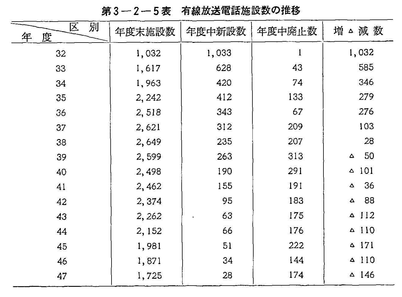 第2節 公衆電気通信施設の現状1 国内公衆電気通信施設(1) 日本電信電話公社関係電電公社は,昭和27年発足以来,累次の5か年計画を実施して,公衆電気通信施設の整備拡充に取り組んできており,45年8月には,第4次5か年計画の拡大修正を含む「電信電話拡充7カ年計画」を策定した。47年度は,当該計画の第2年度に当たり,総額1兆705億円の建設投資をもって,一般加入電話308万加入,地域集団電話10万加入,公衆電話4万個,市外回線13万回線等,大幅な増設,拡充を行った。 ア.一般加入電話 47年度の一般加入電話架設予定数は,当初予算の281万5,000に,補正予算による20万が追加されて,301万5,000となり,その結果,実績では46年度架設数264万を大幅に上回る308万となった。この大量増設の結果,需要充足率は46年度の51.5%より大幅に向上して57.6%に達し,年度末積滞数は,46年度の252万から227万に減少した。また,47年度には一般加入電話数は2,098万加入となり,集団電話等を含めた加入電話総数では2,247万加入となって,人口100人当たり普及率も,46年度の18.2加入から20.8加入へと大きく向上した。加入電話の利用種別(事務用,住宅用別)では,毎年上昇を続けてきた住宅用加入電話の構成比が54%に達したことが注目される。 なお,電話の普及状況を諸外国と比較してみると,47年度末現在,電話機数では3,106万個で米国の1億3,161万個に次いで第2位(第3位は英国の1,757万個)であるが,人口100人当たりの電話機数では28.8個で,電話機数50万個以上の諸外国中第12位であり,1位の米国(62.8個),2位のスウェーデン(59.3個)等に比べ,まだかなり劣っている(諸外国の数値は,1973年1月1日現在のもの。)。 イ.公衆電話 47年度中に街頭公衆電話5,500個,店頭公衆電話3万4,000個,100円公衆電話492個,合わせて4万個の増設が行われ,年度末施設数は街頭公衆電話7万5,000個,店頭公衆電話47万2,000個,100円公衆電話492個となった。 なお,これら年度末施設数のうち,街頭公衆電話においては95%,店頭公衆電話においては74%が大形公衆電話である。 そのほか,ピンク電話の47年度末施設数は53万7,000個となった。 ウ.地域集団電話 地域集団電話は,47年度中に10万2,000加入増設され,138万加入となった。地域集団電話は39年のサービス開始以来.農山漁村地域における共同利用電話として急速に普及したが,43年以降需要は漸減しつつあや,需給は一巡したように思われる。今後は,地域の需要の高度化・多様化に対応したサービスの改善,一般加入電話への変更等が課題となろう。 エ.その他の電話 47年度におけるビル電話,PBX,プッシュホン等特殊な電話の架設状況は,次のとおりである。 オ.加入電信(テレックス) 加入電信の加入数は,47年度中に6,591加入増加し,5万8,975加入となった。 カ.一般専用回線(A規格〜J規格及び高速模写伝送) 一般専用回線は47年度中に1万4,591回線増設されて,22万837回線となった。 キ.市外回線 市外回線は47年度中に13万1,000回線増設されて,93万1,000回線となった。 ク.電報電話局等 47年度末現在,電報電話局数は1,354局,電話局数は177局,電報局数は25局,市外電話局数は11局である。 ケ.要員 47年度には設備の増大に伴う要員増のほか,琉球電信電話公社からの職員の引継ぎ約2,000名があり,年度末における公社職員数は約29万6,000名となった。 これを職務部門別にみると,営業・保守部門約24万4,000名,建設部門約2万3,000名,管理・共通部門等約2万9,000名となっている。 (2) 有線放送電話関係 施設数については,47年度末現在で1,725であり,46年度末1,871に比べて146の減である。施設数は38年度の2,649をピークに39年度から年々減少してきている。これは,新設が少なくなったこと,農協,市町村の統廃合が行われ施設が大型化したこと,及び経営の困難,公社電話の普及に伴い施設を廃止したことによるものである。 施設の業務主体は,農協系の農林漁業団体が最も多くl,224(71.0%)次に市町村等の地方公共団体383(22.2%)で,これらで9割以上を占めている。このほか,公益法人31(1.8%)(以上の3者が単独業務)共同業務87(5.0%)である。 施設の分布状況は,最大は長野県(96),次いで北海道(73),千葉県(68),福岡県,山口県,埼玉県(いずれも65)と続いている。少ないところは宮崎県,大阪府(いずれも6)等で地域により相当アンバランスがある。 ![]() ![]() ![]() ![]() ![]()