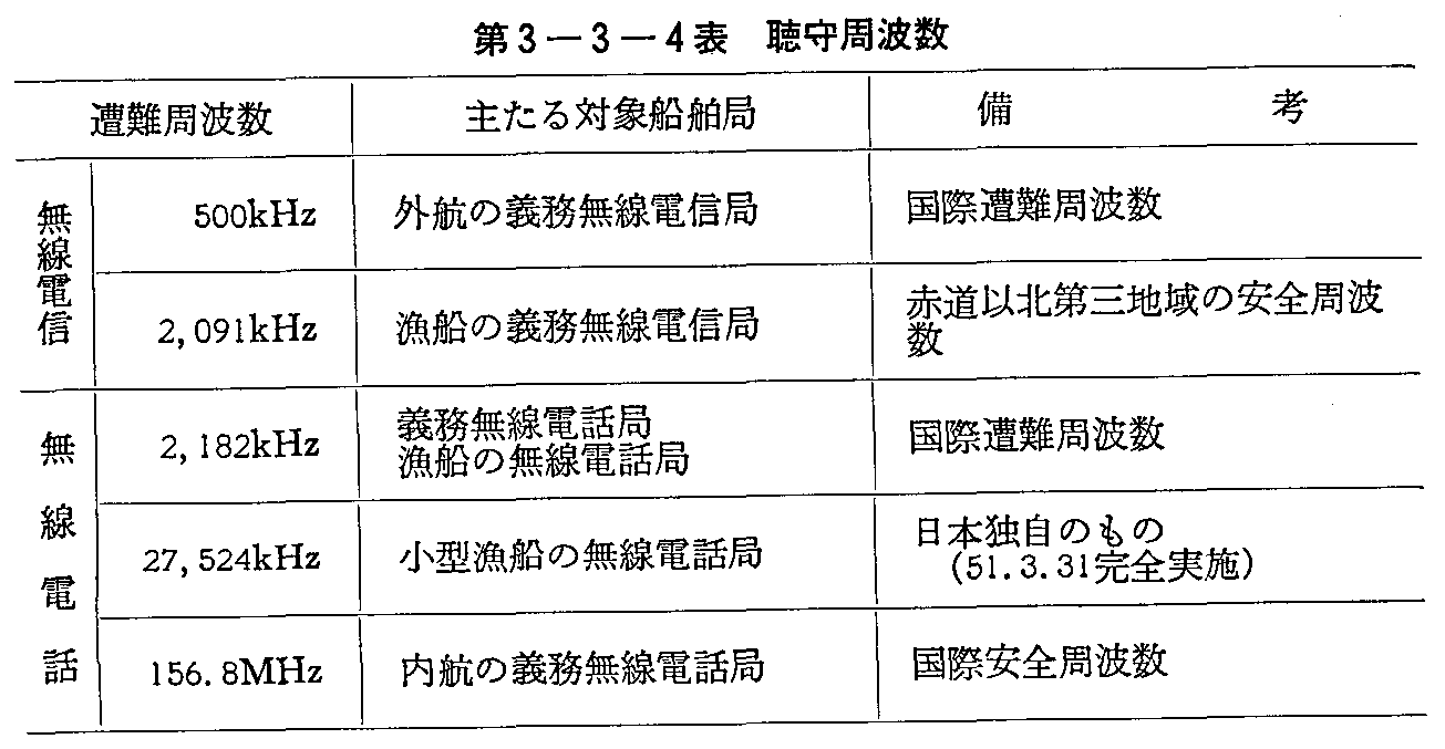 近年,電子技術の著しい進展とともに,社会活動の多様化,情報化の時代を迎え,無線通信の利用分野は著しく拡大するとともに,利用形態も複雑多岐にわたってきた。この結果47年度末には無線局の総数は93万2,819局(対前年度比12%増)の多くに達し,このうち自営の通信業務に供される無線局は90万7,064局で全体の97%を占めており,その利用形態は固定通信と移動通信に大別される。(1) 固定通信 固定地点間の自営通信としての無線の利用は,無線電信法時代においては極めて少なかった。しかし,第2次世界大戦以後我が国の経済,科学技術は飛躍的に発展し,これに伴い無線通信に対する需要は著しく増加し,電波の国民への開放を機としてあらゆる分野の自営通信に無線が導入されることとなった。更に近年においては,官民を問わず企業の合理化又は業務の省力化の手段として無線を取り入れるケースが増加しており,その普及に拍車をかけている。固定局の数を用途別にみると第3-3-1表のとおり広い分野において利用されており,前年度に比べ9.2%の増加を示している。 これらの固定通信は,主としてマイクロ波多重回線によるほか短波回線などによって,全国的又は局地的ネットワークを構成して,各種の業務において重要な役割を果たしている。 なお,災害時における重要通信の疎通を確保するため,回線施設面で各種の対策が講じられている。 また,通信方式は無線電話による音声通信のほか,画像通信あるいはデータ通信等多様化してきている。 (2) 移動通信 ア.航空移動通信 我が国において,航空無線通信業務の取扱いが開始されたのは昭和4年4月である。飛行ルートに沿って東京,大阪,箱根,亀山,福岡にそれぞれ航空無線電信局が開設されたが,航空機にはまだ無線設備が装置されていなかったので,空地通信は行われず航空固定通信のみであった。空地通信は,昭和5年2月日本航空輸送株式会社の航空機に無線電信が設置されてからである。通信は専ら航空機の発着の状況,気象情報,特に気象変化の多い箱根,鈴鹿上空の気象情報を飛行場に通知することであった。その後航空機も年々増加し,16年10月には121局に達していた。 第2次世界大戦後日本の航空活動は官民を問わず一切停止されてしまった。航空活動が実質的に我が国の手にもどったのは27年からである。27年7月日航機に対して戦後初の航空機局の免許が与えられ,また,運輸省は当時羽田空港において運営されていた米国のエアリンクを買収し,東京国際航空通信局を開設して対空通信を開始した。しかし,航空交通管制業務はまだ在日米軍の手にあったので,30年5月この業務が我が国の自主運営に任せられるまでは,我が国の民間航空機も在日米軍の航空局を通信の相手方としていた。27年当時航空局7局(運輸省3,新聞社3,海上保安庁1),航空機局15局(民間航空6,新聞社9),航空固定局8局(運輸省)であったが,その後35年ジェット機の導入,更に45年にはジャンボ機が就航するに及び我が国の航空需要は急速に増加し,航空機局の数は1,000局に達しようとしている。 イ.海上移動通信 海上を航行する船舶と陸上との無線通信は,一般船舶については明治41年に,漁船については明治45年に開始され,以来海上無線通信は60余年の歴史によって培われてきた。船舶において無線通信は欠くことのできない通信手段であって,電波法に定める無線設備の設置を強制されるいわゆる義務船舶局をはじめとして,船舶の安全の確保及び事業の能率的運営のために無線局の開設が必要とされている。47年度末現在,船舶局は,第3-3-2表のとおり4万3,436局に達し,前年度より7.8%の増加を示している。 近年,小型船舶を中心に無線電話の利用が急速に増加しているが,大型船舶における短波無線電話,国際VHF無線電話等の利用が増加するなど電話化の傾向が顕著になっている。47年度末現在,船舶局における電信,電話別の利用状況は第3-3-3表のとおりであって,これを世界各国に比較すると船舶無線電信局は世界第1位,船舶無線電話局は米国に次いで第2位となっている。 海上移動通信は大別して,航行の安全,事業の運営及び港湾出入管理のために行われる。まず船舶の航行の安全のための通信は,海上保安庁の無線局を中心とする陸上側の遭難周波数の聴守の維持,航行援助及び捜索救助の体系をかさにして,船舶側における聴守の維持及び相互救助の体系によって構成され,これがいわゆる遭難通信制度の骨格をなしている。現在我が国の遭難周波数は歴史的経緯,船舶の実態と電波の物理的特性との関係等から第3-3-4表のとおり多岐にわたっており,聴守を複雑にしているが,この集約化はひとり我が国のみならず世界的規模で望まれ,検討されているところである。 無線設備を持たない小型船舶のために開発された遭難自動通報設備は47年度末現在2万1,136隻に普及し,海難救助に効果を発揮している。 船舶を使用する事業運営のための船舶と陸上との通信は,公衆通信によるほか漁業においては漁業用海岸局,内航海運業においては内航用海岸局を設置してそれぞれの事業の用