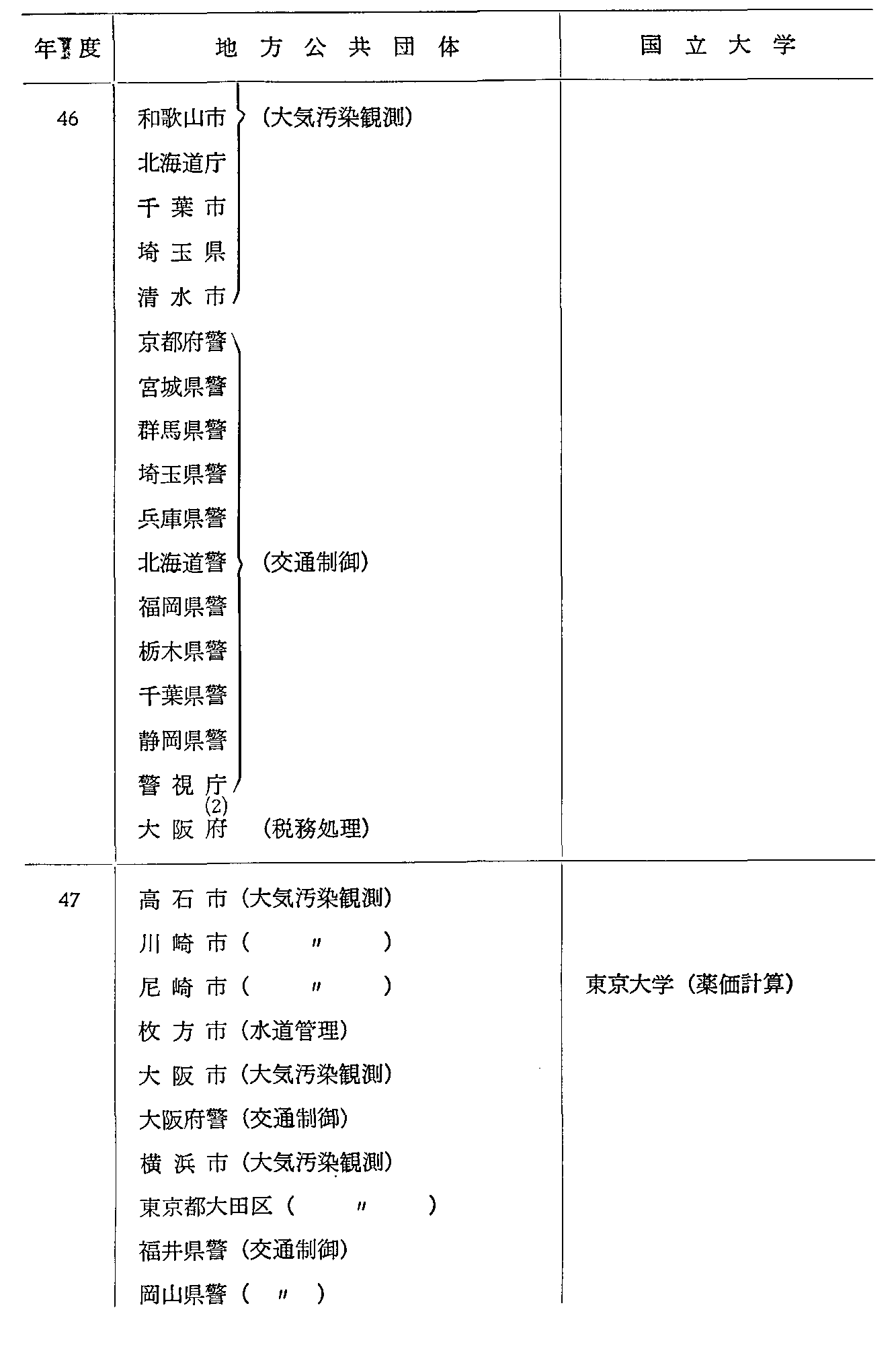 3 行政機関等による利用(1) 利用の現状我が国の行政機関は,行政事務能率の向上を図り,行政サービスを充実させるためデータ通信の導入をはじめとする行政情報処理のEDPS化を進めてきた。 特に,社会,経済活動の急速な拡大,変化は,都市問題,公害問題,交通問題などの新しい問題をひきおこしたが,今やデータ通信は,行政が直面する今日的な課題に対処するための必要不可欠の手段となっている。大都市における交通制御システムや環境保全のための大気汚染観測システムなど時々刻々に変化する状況に即応して有効な対策を打ち出す制御用データ通信システムの設置が具体的なシステム導入例としてあげられよう。 一方,国の行政機関として,各省庁が個別にデータ通信システムを導入していく現状にかんがみ,政府機関が共用の通信ネットワークを形成し,これらシステムの効率的利用を図る必要があるところから行政管理庁及び郵政省が協力して行政情報通信ネットワークシステムに関する調査研究を進めている。 (2) 国の行政機関 国の行政機関の代表的なデータ通信システムである労働省の求人・失業保険システムの概要は,次のとおりである。 ア.業務の流れ システムの構成は第3-4-14図のとおりであり業務処理の流れは,おおむね次のとおりである。 [1] 公共職業安定所及び都道府県は,受理した求人票,求職票,失業保険の各種届などの原票に基づき,さん孔タイプライタによって労働市場センターあての各種データを紙テープとして作成する。 [2] 作成した紙テープは,データ伝送装置にかけることによって自動的に電気信号に変えられ,50b/s規格の速度で特定通信回線によって集配信装置の置かれている道府県に伝送される。 [3] 道府県の集配信装置は,伝送されたデータを自動的に集約して中継局に伝送する。 [4] 中継装置は,送られてきたデータを更に集約し,1,200b/s規格の高速回線で労働市場センターに伝送する。 [5] センターでは,伝送されてきたデータを中央交換装置により区分し,必要な処理をして電子計算機へ回す。電子計算機では送られてきたデータ(求人連絡,求人,求職の照会など)の大部分を即時処理し,結果を折り返し中央交換装置に送る。 [6] 中央交換装置では,このデータを磁気テープに編集した上で各端末あて伝送する。あて先の安定所等においてはデータ伝送装置によって紙テープにさん孔され,さん孔タイブライタにかけて判読できる文字として打ち出される。 イ.システム導入の効果 労働省労働市場センターでは,本システムの導入の効果として,全国の職業安定機関がネットワークで網らされたことにより全国的見地に立った一体的な職業安定行政の運営の基盤が整備されたとしている。 [1] 広域職業紹介業務 従来の書類の郵送による処理方式のもとでは,求人申込から求人連絡まで1週間近くを要していたが,システム導入により求人連絡は即時に連絡先の安定所に通知され,その日のうちに(遅くとも翌日中)あっ旋,紹介の過程に入り得ることになった。また,大都市通勤圏(関東,中部,近畿地方等)ではオンラインで職業紹介が行われている。 求人,求職に対する指導等については,従来は全国の労働市場の状況に関する客観的な資料が乏しかったが,現在は,労働市場センターから提供される豊富で客観的な労働市場情報の活用により的確な指導,相談が可能となり,安定所の窓口におけるサービスの質的向上が図られることとなった。 [2] 失業保険業務 失業保険期間通算業務は,単なる予算,人員の増加によっては解決し得ないものであって,本システムの導入による大量事務の集中処理によってはじめて実施が可能となったものである。 失業保険徴収業務は,従来,都道府県において手作業で行っていた台帳記録,保険料計算等の業務をセンターが行うこととなったため,都道府県における事務が大幅に簡素化された。 (3) 地方公共団体 ア.利用の概況 地方公共団体における電子計算機利用状況は,都道府県47団体(うち,民間等に委託しているもの14団体),市町村1,594団体(うち,民間等に委託しているもの1,314団体)である(48.1.1.現在,自治省調べ)。 47年度末におけるデータ通信システム数は61であり,うち都道府県によるもの41,市によるもの20である。 イ.システムの概況 地方公共団体におけるデータ通信システム導入の歴史は新しく,まず42年度に東京都の農産物流通管理システムが導入されたが,近年における増加状況は著しく,45年度の13システムから47年度末の61システムへと急増している。 これは,[1]最近における公害の深刻化に伴い大気汚染防止法による指定地域を中心に,各都道府県,市によって大気汚染観測システムが導入されたこと及び[2]交通ラッシュ緩和対策の一環として,警察庁の「特定交通安全施設等整備事業五か年計画」に基づく国庫補助を受けて人口30万人以上の都市や県庁所在地を中心に各都道府県警察本部による交通制御システム(交通管制センター)が導入されたことによるものである。 この結果,地方公共団体のデータ通信システムのうち,