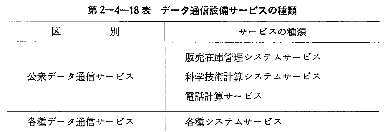 2 電電公社の情報通信事業(1) データ通信設備サービスの種類データ通信設備サービスは,電電公社が電気通信回線及びこれに接続する電子計算機等からなる電気通信設備を一体として設置し,利用者にサービスを提供するもので,この種類は第2-4-18表のとおりである。 公衆データ通信サービスは,電電公社があらかじめ用意したサービスを共同利用する,いわばレディーメイド型サービスであり,「販売在庫管理システムサービス」及び「科学技術計算システムサービス」がある。 各種データ通信サービスは,電電公社がユーザの求めによりその対象業務に応じたサービスを提供するいわばオーダーメイド型サービスであり,「運輸省自動車検査登録データ通信システム」,「全国銀行データ通信システム」等がその例である。 なお,プッシュホン(押しボタンダイヤル電話機)で簡易な計算を行う「電話計算サービス」は,試行サービスであってデータ通信設備使用契約に基づくサービスではないが,便宜上公衆データ通信サービスの中で取り上げることとした。 (2) 公衆データ通信サービス ア.販売在庫管理システムサービス(DRESS) 販売在庫管理システムサービスは,45年9月東京でサービスが開始されて以来,順調な伸びを示し,48年度末現在においてユーザ数364,端末数1,375となっている。 販売在庫管理システムサービスは,今までサービスを拡大していく場合には当該地域にセンターが設置されてきたが,増大する需要に対応するため,48年度においてはサブセンター方式により,新たに横浜,神戸,広島,仙台,松山,金沢等12都市においてサービスが開始された結果,48年度末現在におけるサービスの提供地域は第2-4-19表のとおり拡大された。 なお,サブセンター方式のシステム構成は第2-4-20図のとおりである。 48年度末現在における販売在庫管理システムサービスの利用状況をユーザ数,端末数及び1ユーザ当たりの平均端末数でみると第2-4-21表及び第2-4-22図のとおりであり,ユーザ数,端末数とも対前年度比それぞれ210%と増加しており,1ユーザ当たりの平均端末数は3.8台で,前年度と比較してほとんど同じである。 次に地域的にみると,前述したように横浜,神戸等12都市において新しくサービスが開始されたので,全国的にサービス提供が可能となったが,東京においてはユーザ数,端末数とも対前年度比それぞれ215.2%,243.2%と増加しており,依然としてその需要は高い。 このサービスのユーザの業種別構成の概略は,第2-4-23図のとおりであり,商業57.5%,製造業・建設業37.7%とこれらで全体の95%を占めている。 次に,ユーザの資本金,従業員別事業規模についてみると,資本金においては5千万円以下の企業が約3分の2を占め,従業員数においては100人未満のそれが過半数を占めており,販売在庫管理システムサービスのユーザの大部分は中小企業である。 イ.科学技術計算システムサービス(DEMOS) 科学技術計算システムサービスは,46年3月に東京でサービスが開始されて以来,順調な伸びを示し48年度においては従来の科学技術計算システムサービスのほか,新たに高性能の超大型電子計算機であるDIPS-1を利用した科学技術計算システムサービス(DEMOS-E)が開始され,48年度末現在においてユーザ数458,端末数520となっている。 DEMOS-Eサービスにおいては,従来のDEMOSに対し演算速度や記憶装置の飛躍的向上が図られるほか,使用言語としてCOBOLを加え,1,200b/sの高速データ宅内装置やCRTディスプレイの接続も可能となるなど,ユーザに対するサービスは一段と向上した。 また,科学技術計算システムサービスは,従来のシステムによりサービスを提供している東京,大阪,名古屋のほか,サブセンター方式により新たに全国主要13都市において実施された結果,48年度末現在におけるサービスの提供地域は第2-4-2表のとおり拡大された。 48年度末現在における科学技術計算システムサービスの利用状況をユーザ数,端末数及び1ユーザ当たりの平均端末数でみると第2-4-25表及び第2-4-26図のとおりであり,ユーザ数,端末数とも対前年度比それぞれ約160%と増加している。1ユーザ当たりの平均端末数は,47年度と同じく1.1台となっている。 このサービスのユーザの業種別構成の概略は第2-4-27図のとおりであり,製造業・建設業が85.4%と非常に高い割合を占めている。 また,ユーザの資本金,従業員別事業規模についてみると,資本金においては1,000万円未満の企業が約40%を占める一方,1億円以上のそれも約40%とかなりの部分を占めている。 同様に従業員数においても,100人未満の企業が約50%を占めているが, 1,000人以上のそれも約20%を占めており,科学技術計算システムサービスのユーザの両極化現象がみられ,販売在庫管理システムサービスのユーザの大部分が中小企業であるのに比して著しい対照をなしている。 ウ.電話計算サービス(DIALS) 電話計算サービスのセンターは東京及び大阪に設置されており,このサービスを利用できる地域は,センターあるいはサブセンターの設置された単位料金区域及びその隣接単位料金区域である。48年度において