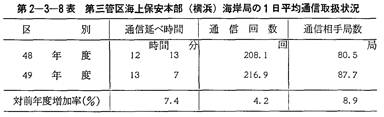 このほか,同庁においては,陸上の無線局において船舶航行の安全を確保するため,航路情報の放送を郵政大臣の告示するところにより行っており,また,関係各国が放送する航行警報を聴守し必要に応じて再放送している。これらの業務の49年度の通信状況を,第三管区海上保安本部(横浜)の海岸局に例をとると第2-3-8表のとおりで,通信延べ時間において前年度に比べ7.4%の増となっている。