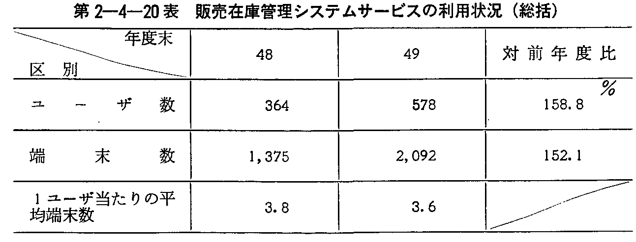 販売在庫管理システムサービスは,販売管理・在庫管理に必要な各種伝票の作成,ファイルの更新,管理資料の作成等の処理ができるサービスとして,45年9月東京で開始されて以来順調な伸びを示し,49年度末現在においてユーザ数578,端末数2,092となっている。