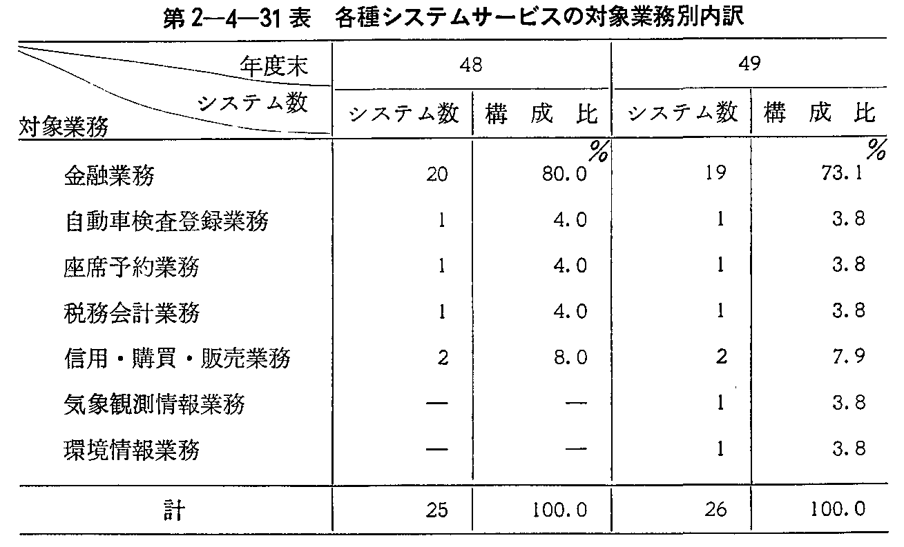 また,49年度末現在におけるシステムを対象業務別にみると第2-4-31表のとおりであり,預金・貸付け・為替等の金融業務が多く19システムとなっている。