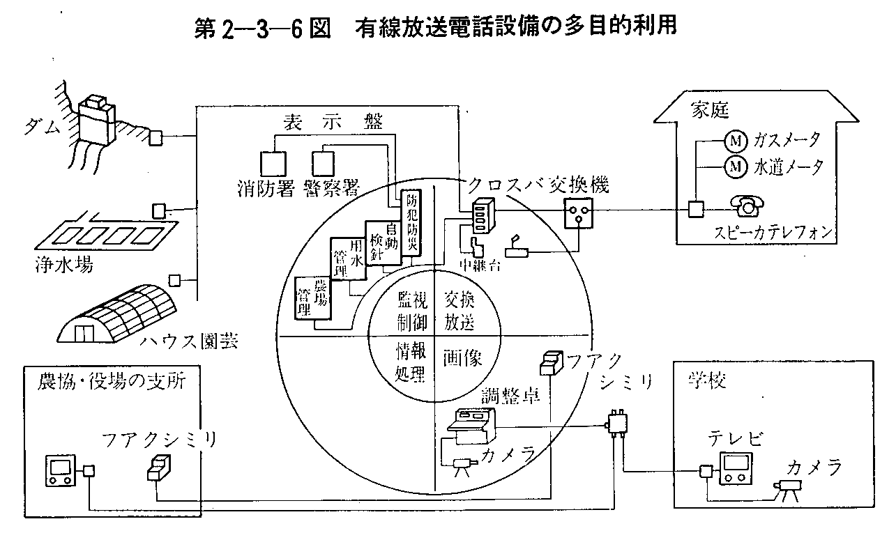 2 有線電気通信有線電気通信法の下では,有線電気通信設備の設置は原則として自由であり,郵政大臣への届出だけで設置できることになっている(特定の場合は届出の義務も免除されている。)。有線電気通信法における設置の自由の原則は,設置者が自己の通信の用に供するときに限られ,公衆電気通信事業を電電公社又は国際電電に行わせる建前の下に,一般の者が有線電気通信設備を[1]共同して設置し,[2]相互に接続し,[3]他人に使用させること,については公衆電気通信役務となるおそれがあるため,有線テレビジョン放送,有線ラジオ放送等を除いて,原則としてこれを禁止している。 しかし,最近,情報ニーズの多様化に伴って有線電気通信設備の利用もまた多様化している。 すなわち,CATVの多様な利用,有線放送電話の多目的利用,公社の専用線と自営電気通信設備とのシステム構成による利用等その利用が,システム的により複雑化,高度化してきている。 このような有線電気通信設備の利用の態様に伴い,現行制度の考え方も新たな視点から見直すことが必要となってきている。 (1) 設置の状況 ア.単独設置 50年度末における有線電気通信設備の届出件数は23,430件であり,前年度末に比べて1,457件増加している。 その内訳は,有線テレビジョン放送施設14,799件(63.1%),有線ラジオ放送設備6,995件(29.9%)及び電話,ファクシミリ等の有線電気通信設備(以下「一般の有線電気通信設備」という。)1,636件(7.0%)である。 イ.共同設置 50年度末における有線電気通信設備の共同設置の許可件数は8,560件であり,前年度末に比べて54件減少している。これを許可の内容別にみると次のとおりである。 [1] 共同業務(有線法第4条第4号) 11件( 0.1%) [2] 緊密業務( 〃 第4条第5号) 8,506〃(99.4〃) [3] 特定地域( 〃 第4条第6号) 43〃( 0.5〃) ウ.本邦外設置 本邦外にわたる有線電気通信設備の設置は,原則として,電電公社又は国際電電以外の者は設置できないが,特別の事由がある場合には郵政大臣の許可を得て設置できることとなっている。 これにより許可を行った件数は,50年度末現在で4件であり,その内容は次のとおりである。 [1] 第一太平洋ケーブル 日本(神奈川県・二宮町)―米国(ハワイ州・マカハ) 9,890km [2] 第二太平洋ケーブル 日本(沖縄県・具志頭村)―米国( 〃 〃 ) 9,390km [3] 日本海ケーブル 日本(新潟県・上越市) ―ソ連(ナホトカ) 890km [4] 日中ケーブル 日本(熊本県・苓北町) ―中国(上海市) 850km (2) 使用の状況 有線電気通信設備の設置の自由の原則は,設置者がその設備を自己の通信に使用することを前提としているものであるが,その設備を他人の設置した設備と接続して使用したり,他人に使用させたりすることは原則として禁止されており,特別の事由がある場合に,郵政大臣の許可を得て行うことができることとなっている。 ア.接続の許可 昭和50年度末における許可件数は16件であり,前年度末に比べて増減はない。これを許可事由別にみると次のとおりである。 [1] 共同業務(有線法第9条第5号) 0件( 0.0%) [2] 緊密業務( 〃 第9条第6号) 16〃(100.0〃) [3] 特定地域( 〃 第9条第7号) 0〃( 0.0〃) イ.他人使用の許可 50年度末における許可件数は254件であり,前年度末に比べて増減はない。これを許可事由別にみると次のとおりである。 [1] 特定地域 (有線法第10条第 5号) 7件( 2.8%) [2] 公共の利益( 〃 第10条第16号)247〃(97.2〃) (3)特定地域設備 有線電気通信法上,都市からの距離が遠く,電電公社が公衆電気通信役務を提供することが困難であると認められる地域(一の市町村の区域内にあって,電話加入区域外の地域)は,特定地域として扱われその地域に設置された有線電気通信設備は特定地域設備として位置づけられている。 この特定地域設備は,前記の(1)共同設置に係るもの43件と前記(2)の他人使用に係るもの7件の合計50件であるが,前年度末に比べて12件の減少となっている。これは,公社電話の普及に伴い特定地域設備の必要性がなくなり,廃止するためである。 (4)事業別の利用状況 ア.一般の有線電気通信設備 有線電気通信法上届出ることとなっている設備のうち,有線放送設備を除いた設備を事業別にみると,農林漁業510件(31.2%)が最も多く,以下製造業256件(15.7%),サービス業89件(5.4%),運輸業74件(4.5%),建設業74件(4.5%),卸・小売業65件(4.0%),ガス・水道事業21件(1.3%),その他これらに区分できない事業547件(33.4%)となっており,広範囲に利用されている。 イ.有線放送設備 有線放送設備(有線ラジオ放送設備及び有線テレビジョン放送施設をいう。)は,不特定多数の者(公衆)に一方的に同一番組を送信するための有線電気通信設備であり,一般の有線電気通信設備が両方向を前提としているのに比べ,特殊の用途に限られたものといえる。 50年度末における有線ラジオ放送設備は7,552件であり,前年度に比べ98件減少している。この内訳は,共同聴取業務又は告知放送業務を行うもの6,052件,街頭放送業務を行うもの1,500件である。告知放送業務のうち,音楽放送を行うものは494件である。 また,有線テレビジョン放送施設は14,969件であり,前