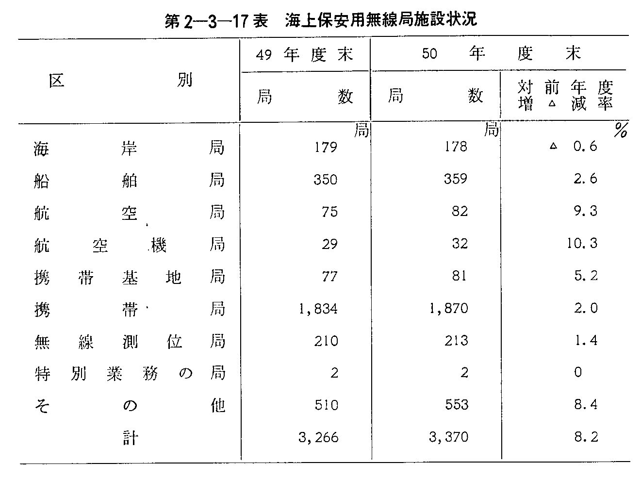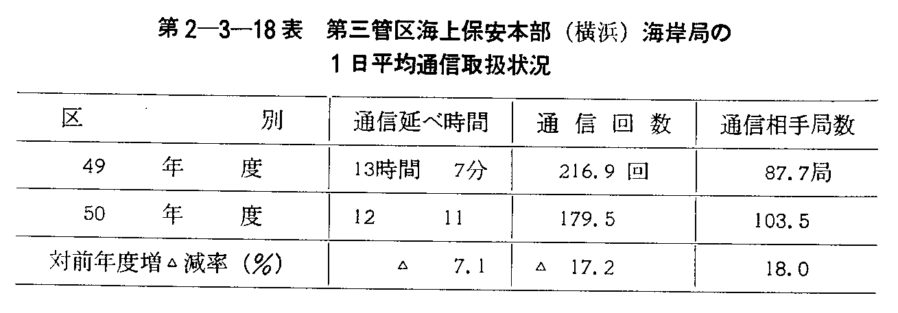 3 海上保安用海上における船舶交通の安全の確保,人命財産の救助,汚染の防止及び治安の維持を任務とする海上保安庁は,我が国周辺海域における警備救難,航行援助等を行うため,船舶局,航空機局等による移動通信係のほか全国固定通信系,携帯移動通信系を構成して海上保安通信を行っている。50年度末現在これらの無線局の数は第2-3-17表のとおり3,370局に達している。(1) 警備救難用通信 海上保安庁は海難の救助,治安の維持その他海上における船舶交通の安全に関する通信を効果的に行うため,全国に設置した海岸局及び巡視船艇の船舶局においてその規模に応じ常時又は一定の時間,第2-3-4表の遭難周波数を聴守し,全国22箇所に遭難電波の方位を測定する施設を設置して海難救助に備えるとともに,同庁の主要海岸局においては,港内における船舶交通の安全,港内の整理及び船舶交通がふくそうする航路,狭水道等における船舶交通の安全を確保するための通信を行っている。更に,海難救助機関において常に特定の船舶の動向をは握し,海難の際の救助に資するいわゆるアンバーシステム(相互海難救助制度)に釧路,塩釜,横浜等の8海岸局が参加している。 このほか,船舶航行の安全を確保するため,主要海岸局及び特別業務の局において気象及び航行警報の放送を行うとともに関係各国が放送する航行警報を聴守し,必要に応じて再放送している。 また,海上保安通信体制の充実強化及び施設の近代化を図るため,陸上通信所統合再編成計画を策定し,これを推進しているが,50年度には瀬戸内海西部地区の海岸局等の整備統合が行われた。 これらの業務の50年度の通信状況を,第三管区海上保安本部(横浜)の海岸局に例を取ると第2-3-18表のとおりで,通信延べ時間において前年度に比べ7.1%減となっている。 (2) 航行援助用通信 海上保安庁は,また,我が国沿岸の地理的条件と船舶交通の状況に応じて,電波を利用した航路標識施設を設置し,航行の安全と運行能率の向上に寄与している。 近年船舶交通がとみに活発の度を加えている主要港湾及び狭水道において航行の安全を確保するためには,陸上からきめ細かい情報を積極的に提供して航行船舶を援助するとともに,適切な船舶交通の管制を行う必要が生じている。このため最新の電子技術を導入した海上交通情報機構の設置を推進しているが,京浜港川崎区塩浜通航信号所,京浜港横浜区本牧船舶通航信号所及び横浜港内交通管制室と本牧の京浜ハーバーレーダを連係したシステムの完成により,京浜港の一部港域内の航行援助及び管制を行っている。 49年度に観音崎にハーバーレーダ(実用化試験局)が設置され,このハーバーレーダと京浜ハーバーレーダの映像をコンピュータにより一元的に処理するためのシステムの開発が引き続き行われている。これが完成した暁には,観音崎がこのシステムのセンタとなり,東京湾内の浦賀水道,中ノ瀬航路,京浜港横浜区沖及びこれらの付近における航行援助及び管制が可能となる。 これらの業務のための船舶上の間の無線通信にはVHF無線電話(国際VHF)が使用されるが,従来から警備救難及び港長事務にもこの無線電話が使用されているほか,海上交通安全法の航路管制にも用いられるので,今後このVHF無線電話(国際VHF)の電波の有効利用を図る必要があろう。 50年度においては,対馬にオメガ局が,東北地区にデッカ局3局が新たに開設された。 これらの航行援助用の局は50年度末現在第2-3-19表のとおり94局に達している。 ![]() ![]() ![]()