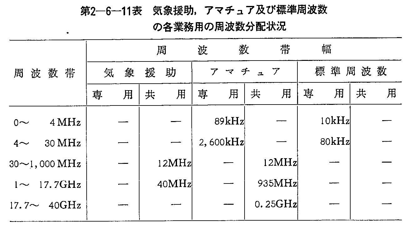 3 周波数割当(1) 概 要無線局に周波数を割り当てる場合には,一般に次の事項を考慮して行っている。 [1] 周波数分配表に従うこと。 [2] 周波数に関する国際的な規律に従うこと。 [3] 周波数割当計画が定められている場合にはこれに従うこと。 [4] 周波数の効率的利用を図ること。 [5] 電波の型式,必要周波数帯幅,伝搬特性,保護すべき電界強度等の電波の技術的特性を考慮し,既設局に有害な混信を与えないようにすること。 51年度末現在,割り当てられた周波数の数は,第2-6-3図に示すように約7,600波に達し,長波からマイクロ波までほとんどくまなく割り当てられている。 特に移動業務に適しているVHF帯は,都市部における陸上移動業務及び沿岸無線電話を中心とする海上移動業務の伸びが著しく,VHF帯の混雑緩和は現在の周波数監理上最も重要な課題の一つとなっている。 また,マイクロ波帯についても,最近は通常のいわゆるマイクロ波通信回線のほか,レーダ,気象観測,航空管制等の用途が拡大され,更に宇宙通信の本格化を控え,混雑の度合いは徐々に高まっており,準ミリ波帯,ミリ波帯の開発が急がれている。 一方,短波帯は従来からその混雑が国際的に大きな問題となっており,最近の国際通信の分野において海底ケーブル,対流圏散乱波通信,衛星通信等の広帯域通信回線が逐次整備されてきているものの,現段階においてはまだ主として短波に頼らざるを得ない海上移動業務及び短波放送業務の分野では,依然として国際的にし烈な需要がある。このため,1979年に開催される世界無線通信主管庁会議において,特に短波帯以下の周波数分配については,大幅な再編成を行うことになると考えられる。 (2)業務別周波数割当の現状 ア.固定業務 固定業務に分配されている周波数帯は,第2-6-4表に示すとおりである。 (ア) 30MHz以下の周波数帯は,数年前までは国際通信用として広く使用されてきたが,衛星通信,海底ケーブルの導入により国際通信に占める役割は減少の一途をたどり,現在,短波回線が全回線数に占める比率は約1%にすぎなくなっている。したがって今後は主として衛星,ケーブルのいずれも使用することが困難な対地向け通信回線用として使用されることとなろう。 また,国内通信用としては,離島通信,市況情報等の同報通信,災害対策用,保安用等短波帯の特質を生かした回線に使用されている。 (イ) 30MHz〜1,000MHzの周波数帯は,中小容量の局地系の通信,災害対策用の通信,音声放送の中継,移動業務における通信所と送受信所間の連絡回線等に割り当てられており,今後もかなりの需要が見込まれている。 この周波数帯は,移動業務に最も適した周波数帯であり,今後固定業務のために新たな周波数帯を設けることは困難なので,既割当ての周波数帯内での効率的使用を図る必要がある。 (ウ) 1GHz以上の周波数帯は,一般にマイクロ波帯といわれる周波数帯で大容量の無線中継方式に適し,公衆通信及び公益,治安,行政等の業務の幹線系,支線系の通信網に広く使用されている。この周波数帯については,我が国は世界有数のマイクロ波利用国といわれるように高い密度で使用されている。 また,将来のマイクロ波帯の需要は情報化の進展とともにデータ通信,画像通信等の新しい通信需要を含め,大幅な増大が予想されているので,今後,空中線の指向性を利用して地域的な周波数の共用を一層図っていくとともに,いわゆる準ミリ波帯及びミリ波帯の開発あるいは衛星通信の利用を進めていく必要がある。 イ.放送業務 放送業務に分配されている周波数帯は,第2-6-5表のとおりである。 (ア) 標準放送 標準放送は,525kHz〜1,605kHzの中波の周波数帯を使用している。 標準放送波帯は世界的に非常に混雑しており,更に周波数間隔が第一地域(ヨーロッパ,アフリカ)では9kHz,第三地域(アジア,大洋州)では10kHzと異なっているため,いわゆるビート混信を生じ,周波数の利用効率を著しく低下させているなどの理由から,長・中波放送に関し1974年及び1975年に両地域の合同主管庁会議が開催され,各国からの周波数要求を基に,割当周波数を9kHzの整数倍に統一する周波数割当計画が作成され,地域協定の成立を見た。この協定によって新しい周波数割当計画が1978年11月23日0001GMTから発効することとなり,それ以降は混信の主な原因の一つであったビート混信は解消されることが期待されている。 なお,我が国ではこの協定に基づいて「標準放送用周波数割当計画」を1976年4月に修正した。 (イ) 超短波放送 いわゆるFM放送のための超短波放送用の周波数としては,76MHz〜90MHzが分配されており,「超短波放送用周波数割当計画」に従ってNHK及び民間放送に対し割当てが行われている。 (ウ) 短波放送 短波帯で放送用に分配されている周波数帯は,3,6,7,9,11,15,17,21及び25MHz帯の一部で合計462ch(5kHz間隔)である。 我が国では国内放送用として6波の割当てを行っているほか,国際放送用として32波の割当てを行っている。 短波帯の放送業務用の周波数については,附属無線通信規則の規定により年4回季節別の周波数をIFRBに