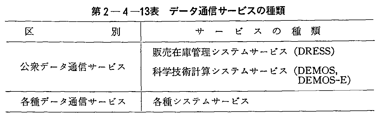 データ通信設備サービスは,電電公社が電気通信回線及びこれに接続する電子計算機等からなる電気通信設備を一体として設置し,利用者にサービスを提供するもので,この種類は第2-4-13表のとおりである。