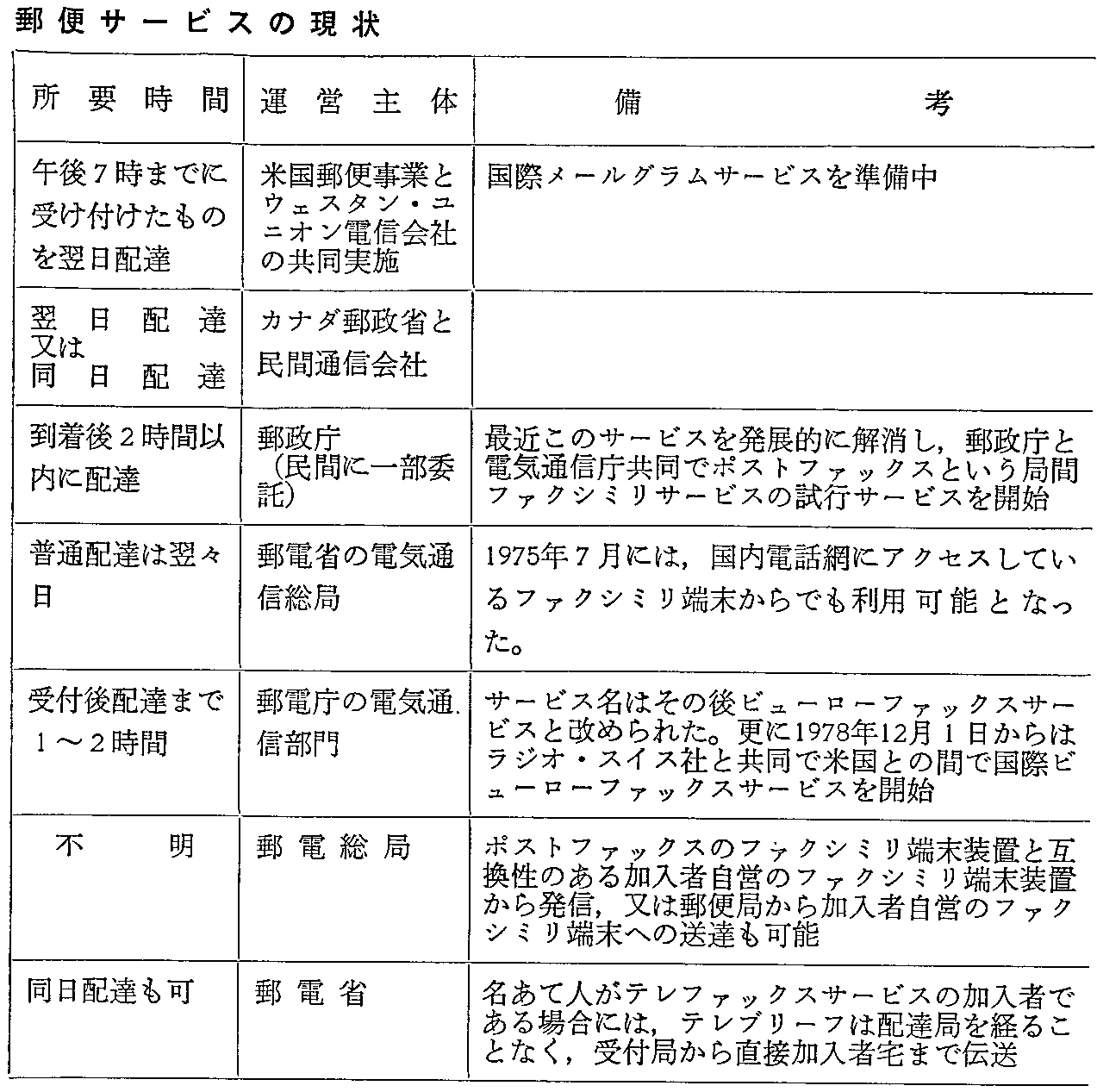 2 画像通信の開発動向(1) 電子郵便ア.電子郵便の現況 近年急速に発達した電気通信技術を用いた電子郵便サービスの各国の現状は第1-2-49表のとおりであるが,米国のメールグラムサービスを除いては利用は多くない。 米国のウェスタン・ユニオン電信会社(WUT)が米国郵便事業(USPS)と提携し提供しているメールグラムサービスは,米国本土のどこにでも翌日配達を保証する電子郵便サービスで,1970年に導入され,1972年に実質的な営業が開始された。メールグラムサービスの特色は,WUTの電子交換及び伝送装置の高速性とUSPSの市内配達組織の経済性とを結びつけた点で,企業,一般公衆に広く受け入れられている。このため,サービスの成長は第1-2-50表及び第1-2-51図にみるとおり着実であり,1978年度にはWUTの全収入の9.3%を占めるまでになった。 イ.新たな展開を始めた電子郵便 USPSは,メールグラムの成功,郵便事業経営の将来展望,電子送金サービスの登場といった各種要因を考慮し,米国研究諮問委員会の報告及び郵便事業委員会の勧告を踏まえて,現在,コンピュータ発信電子郵便(ECOM)及び国際電子郵便(インテルポスト)の計画を推進している。 ECOMは,自己のコンピュータを有する大企業利用者を対象とし,25都市の郵便局網を利用して全米50州における翌々日配達を保証するシステムで,郵便事業における本格的な電子郵便システムの過渡的な形態である。 ECOMメッセージは差出人のコンピュータ等によって直接に送付されるか,あるいは磁気テープの形で差し出され,あらかじめ指定された取扱郵便局に電子的に伝送される。郵便局ではそれを高速プリンタによってハードコピーに転換,封入し,通常郵便物とともに配達する。料金は1通当たり30〜55セント,年間送信数は約50億通を見込んでいる。 なおECOMは,将来総合的な電子郵便システムである電子メッセージ・サービス・システム(EMSS)へ事実上移行していくこととなっている。 EMSSは,企業,官公庁及び家庭の利用者を対象とした電子郵便システムで,全米の95%に対する翌日配達が目標とされている。このシステムでは通常のハードコピー・メッセージに加え,コンピュータ,ファクシミリ等からの電子的入力も受付け可能である。なお,ハードコピーは郵便局に設置された公衆用入力装置に入力され,OCR/ファクシミリにより磁気テープ等に変換されてEMS局へ電子的に伝送される(第1-2-52図参照)。 一方,インテルポストはUSPSとコムサットの共同計画による国際電子郵便の実験サービスで,インテルサット<4>-A号衛星を介してアルゼンティン,ベルギー,西独,フランス,イラン,オランダ及び英国の7か国との間で行われる計画である。 ところで,電子郵便は郵便と電気通信が重合化したメディアであるため,米国においては,その境界領域をめぐってUSPSと連邦通信委員会(FCC),電気通信事業者との間で議論が行われている。 USPSは,1979年9月に監督機関である郵便料金委員会(PRC)に対し,ECOMの認可申請を行ったが,これに対し,FCCはECOMの管轄権を主張し,また,タイムネット,グラフネット,AT&T等の民間の通信事業者は,USPSの電子郵便サービス分野への進出は独占的支配をもった競争者の出現ととらえ,強く異議を唱えている。なお,1979年7月,カーター大統領が条件つきながらUSPSの電子郵便計画を支持する声明を発表し,更に同年12月にPRCが大統領声明の趣旨に沿って,契約者をWUT社1社に限定するのではなく,取扱いを希望する多くの通信事業者に通信業務を委託できるなどの内容を織り込んだ新しい内容・目的の電子郵便を認め,USPSもこれを基本的に受け入れたことから,ECOM計画は新たな段階を迎えている。 (2) 国際的競争下のビデオテックス 現在,我が国をはじめ欧米主要国では,テレビ受像機をディスプレイ端末として利用し,情報検索サービスを提供するビデオテックスシステムの開発が活発に行われている(第1-2-53表参照)。取り分けヨーロッパ諸国においては1日4〜5時間しか使われていないテレビのブラウン管の有効利用を図ることにより新たな需要を創出し,各種産業を賦活・育成するとの政策的配慮から熱心な取組みを行っている。 ビデオテックスシステムの原型となったプレステル(PRESTEL)を開発した英国郵電公社(BPO)は,このシステムを国の重要施策の一つに位置づけており,このため1979年3月,世界に先駆けて商用サービスを開始する一方,積極的な海外マーケッティング活動を展開している。BPOがプレステルの開発に投資した資金規模は商用開始までに約2,300万ポンドであったが,1984年までには更に約1億ポンドが追加されるものと予想されている。 商用サービスは,現在,ロンドン,ノッチンガム,グラスゴー,エジンバラ及びバーミンガムの5地域で提供されており,1980年中には更に13地域が追加される予定であるが,これにより英国の電話加入者の約50%がカバーされることになる。ただし,端末機の普及は必ずしも順調ではなく,強力な施策が必要とされている。 フランスでは,コンピュータ,端末機器,電気通信施設に対する国内需要を高めることにより,フランスの