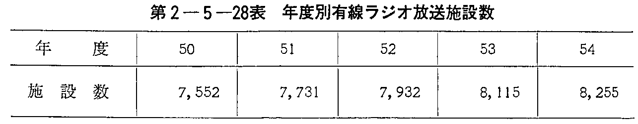 2 有線ラジオ放送54年度末における有線ラジオ放送施設数は,8,255施設であって,前年度末に比べ140施設(1.7%)の増加となっている。都道府県別の施設数は,第2-5-27表のとおりである。また,最近5年間の有線ラジオ放送施設数の推移は,第2-5-28表のとおりである。有線ラジオ放送業務は,共同聴取業務(ラジオ放送を受信して再送信するもの),告知放送業務(ラジオ放送以外の音声その他の音響を送信するもの)及び街頭放送業務(道路,広場,公園等公衆が通行し,又は集合する場所で,音声その他の音響を送信し,又はラジオ放送を受信して再送信するもの)に分類される。 告知放送業務としては,農山漁村において地域情報や農事関係ニュース等を放送するもの,この業務とラジオ放送の共同聴取業務を併せて行うもの,以上の業務と電話業務を併せて行うもの,都市において飲食店等に音楽を放送するもの(有線音楽放送)がある。 54年度末における業務別の有線ラジオ放送施設数は,第2-5-29表のとおりである。