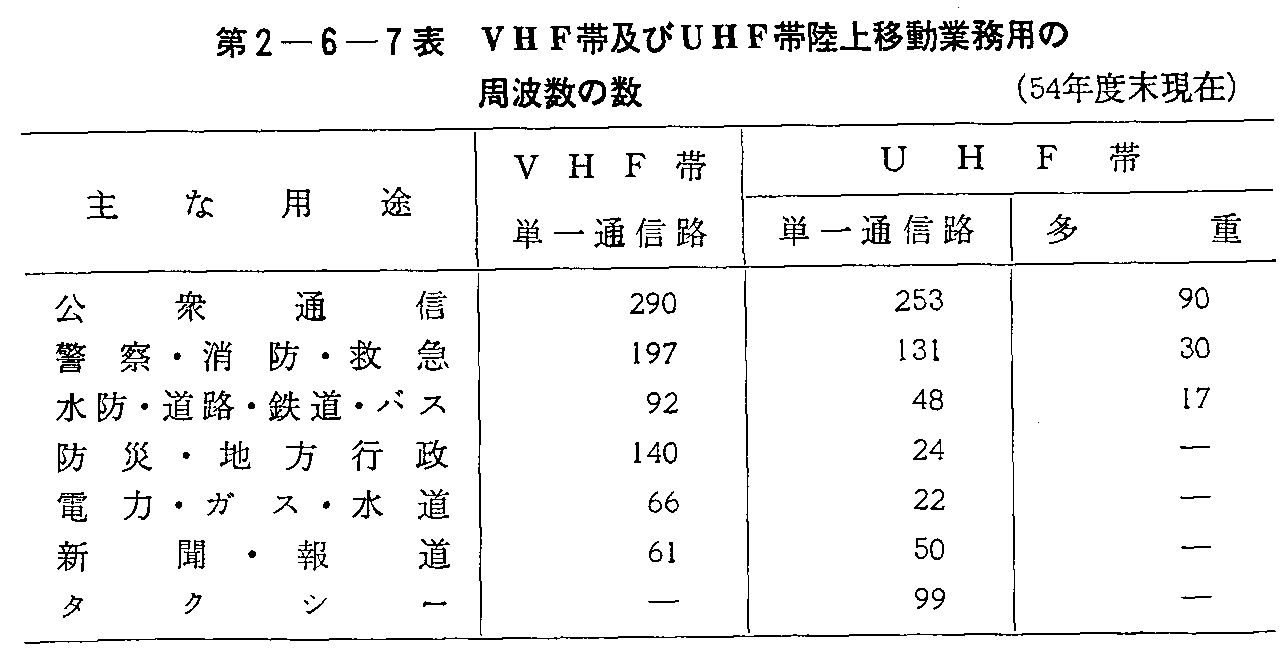 3 周波数割当(1) 概 要無線局に周波数を割り当てる場合には,一般に次の事項を考慮して行っている。 [1] 周波数分配表に従うこと。 [2] 周波数に関する国際的な規律に従うこと。 [3] 周波数割当計画が定められている場合にはこれに従うこと。 [4] 周波数の効率的利用を図ること。 [5] 電波の型式,必要周波数帯幅,伝搬特性,保護すべき電界強度等の電波の技術的特性を考慮し,既設局に有害な混信を与えないようにすること。 54年度末現在,割り当てられた周波数の数は,第2-6-3図に示すように約9,200波に達し,長波帯からマイクロ波帯までほとんどくまなく割り当てられている。 特に移動業務に適しているVHF帯は,都市部における陸上移動業務及び沿岸無線電話を中心とする海上移動業務の伸びが著しく,VHF帯の混雑緩和は現在の周波数監理上最も重要な課題の一つとなっている。 また,マイクロ波帯についても,最近は通常のいわゆるマイクロウェーブ回線のほか,レーダ,気象観測,航空管制等の用途が拡大され,更に宇宙通信の本格化を控え,混雑の度合いは徐々に高まっており,準ミリ波帯,ミリ波帯の開発が急がれている。 一方,短波帯は従来からその混雑が国際的に大きな問題となっており,最近の国際通信の分野において海底ケーブル,対流圏散乱波通信,衛星通信等の広帯域通信回線が遂次整備されてきているものの,主として開発途上国においては依然として国内・国際通信とも短波に依存するところが多く,また,世界的にも海上移動業務,短波放送業務の分野では,短波の需要が増大していることから,依然として国際的にし烈な需要がある。このため1979年ジュネーブにおいて開催された世界無線通信主管庁会議(以下この節において「WARC-79」という。)においては,特に短波帯以下の周波数分配について大幅な再編成が行われた。 (2) 業務別周波数割当の現状 ア.固定業務 固定業務に分配されている周波数帯は,第2-6-4表に示すとおりである。 (ア) 30MHz以下の周波数帯は,10数年前までは国際通信用として広く使用されていたが,衛星通信,海底ケーブルの導入により国際通信に占める役割は減少の一途をたどり,現在,短波回線が全回線数に占める比率は1%未満にすぎなくなっている。したがって,今後は主として衛星,ケーブルのいずれも使用することが困難な対地向け通信回線用として使用されることとなろう。また,国内通信用としては,市況情報等の同報通信,離島通信,災害対策用の通信,保安用の通信等短波帯の特性を生かした通信回線に使用されている。 WARC-79においても固定業務の局に対する短波帯の使用は,なお需要の多い開発途上国にできる限り振り向けるよう各国は協力することとなった。 (イ) 30MHz〜1,OOOMHzの周波数帯は,中小容量の局地系の通信,災害対策用の通信,音声放送の中継,移動業務における通信所と送受信所間の連絡回線等に割り当てられており,今後もかなりの需要が見込まれている。 しかしながら,この周波数帯は,移動業務に最も適した周波数帯であり,今後とも移動業務に対する需要は増大が予想されることから,固定業務用周波数については可能な限り1GHz以上の周波数帯に移行するなどして移動業務の拡大に対処する必要がある。 (ウ) 1GHz以上の周波数帯は,一般にマイクロ波帯といわれる周波数帯であり,大容量の無線中継方式に適し,公衆通信,テレビジョン放送中継及び公益,治安,行政等の業務の幹線系,支線系の通信網に広く使用されている。また,小容量固定多重回線に2GHz帯でPCM方式が導入されたことにより,従来400MHz帯を使用していた小容量固定多重回線は,できる限り2GHz帯に移行することとした。このように,この周波数については,我が国は世界有数のマイクロ波利用国といわれるように,高い密度で使用されている。 将来のマイクロ波帯の需要は,情報化の進展とともにデータ通信,画像通信等の新しい通信需要を含め,大幅な増大が予想されているので,今後,空中線の指向性を利用して地域的な周波数の共用を一層図っていくとともに,いわゆる準ミリ波帯の開発あるいは衛星通信の利用を進めていく必要がある。 イ.放送業務 放送業務に分配されている周波数帯は,第2-6-5表のとおりである。 (ア) 標準放送 標準放送は,525kHz〜1,605kHzの中波の周波数帯を使用している。この周波数帯の割当てについては,LF/MF帯放送に関する地域主管庁会議(1975年ジュネーブ)の協定に基づいて,「標準放送用周波数割当計画」を作成して行われている。 (イ) 短波放送 短波帯で放送用に分配されている周波数帯は,3,6,7,9,11,15,17,21及び25MHz帯において合計462ch(5kHz間隔)である。 我が国では,国内放送用として6波の割当てを行っているほか,国際放送用として約30波の割当てを行っている。 短波帯の放送業務用の周波数については,附属無線通信規則の規定により,年4回季節別の周波数をIFRBに提出し,FRBは技術審査と各国間の調整を行い,必要に応じて関係主管庁に勧告を行うこととなっており,この勧告を受けた主管庁は,これを勘案して周波数の割当てを行うという建前がとら