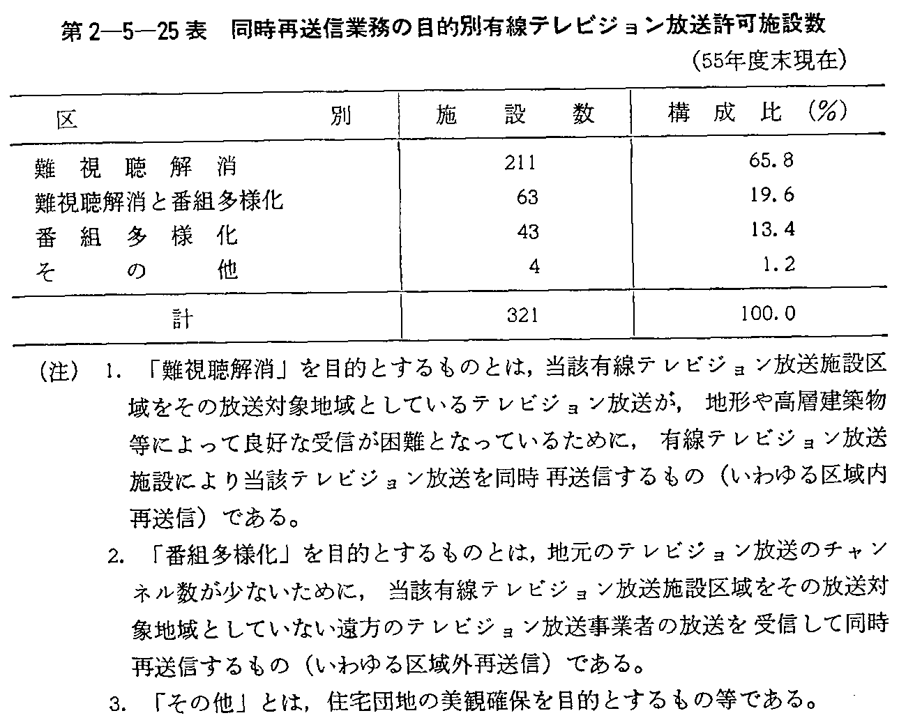 業務の内容をみると,55年度末現在で同時再送信のみを行うもの1万6.292施設(99.8%),同時再送信と自主放送を行うもの13施設(0.1%),自主放送のみを行うものが同じく13施設(0.1%)となっており,テレビジョン放送の難視聴の解消を目的とするものがほとんどである。