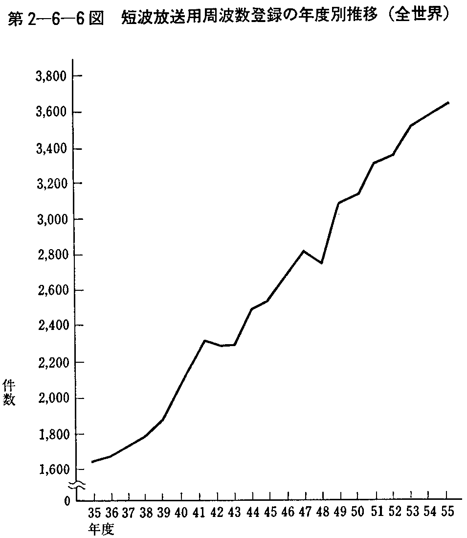 一方,短波帯は従来からその混雑が国際的に大きな問題となっており,最近の国際通信の分野において海底ケーブル,対流圏散乱波通信,衛星通信等の広帯域通信回線が逐次整備されてきているものの,主として開発途上国においては依然として国内・国際通信とも短波に依存するところが多く,また,世界的にも海上移動業務,短波放送業務の分野では,短波の需要が増大していることから,依然として国際的にし烈な需要がある。