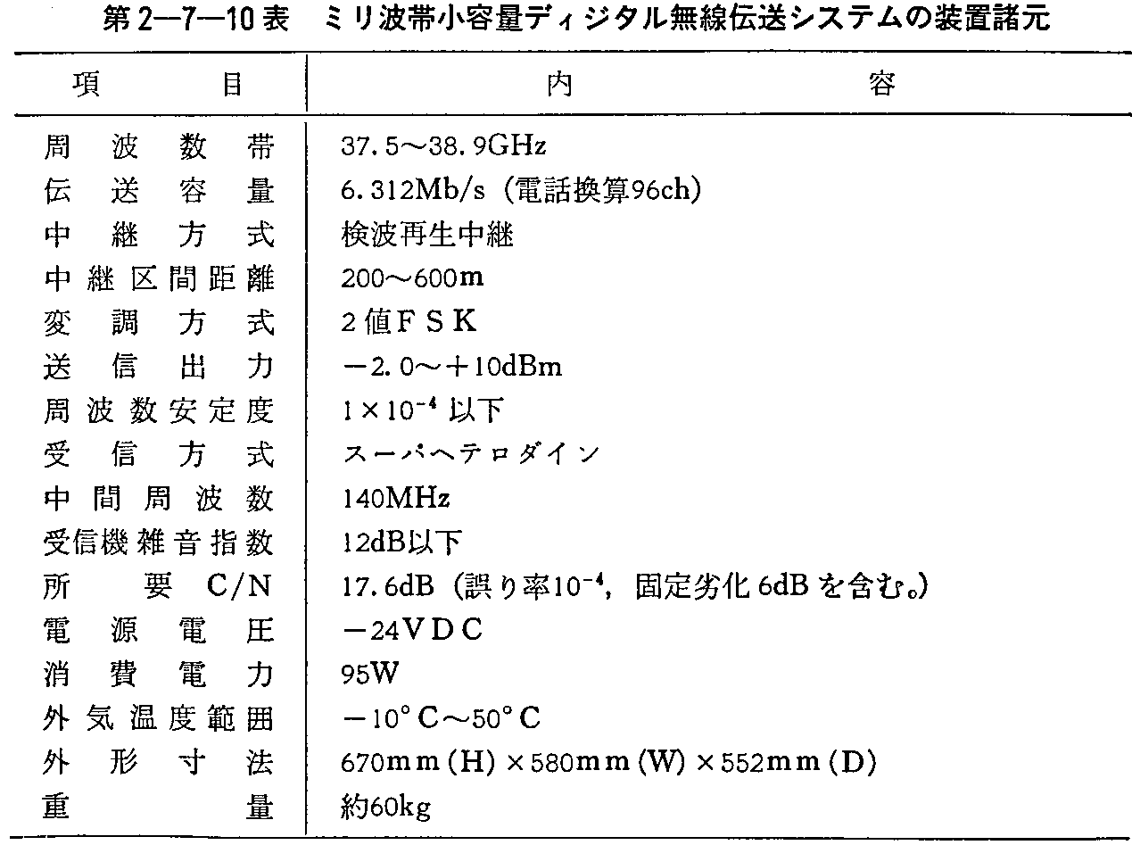 こうした中で,最近の半導体素子技術の急速な発達もあって,ミリ波帯電波を利用した通信システムの実用化が始まった。56年3月,我が国としては初の40GHz帯(37.5〜38.9GHz)の電波を用いた実用局が国土庁によって開設された。防災関係行政機関を結ぶ中央防災無線網の一部6区間に小容量ディジタル無線システムとして導入され,現在順調に運用が行われている。本システムの主な諸元は第2-7-10表のとおりで,1システム当たり6.312Mb/s(電話換算96ch)の伝送容量を持ち,2値FSK信号として伝送するもので,アンテナ及び無線送受信装置は一体となって一つのケースに収められている。