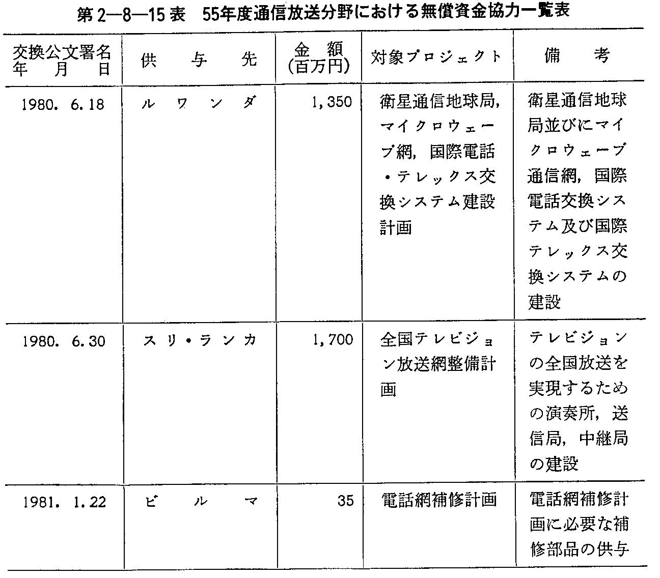 また,無償資金協力として55年度はスリ・ランカの全国テレビジョン放送網整備計画,ルワンダの衛星通信地球局建設計画及びビルマの電話網補修計画に対し,計31億円の贈与が行われた。