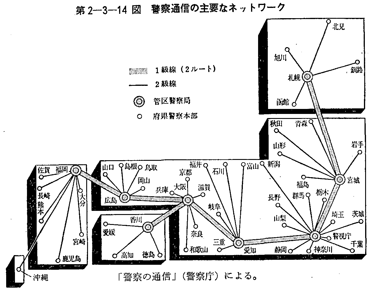 (1)現 状 ア.警察事務と通信 複雑,多様化かつ広域化する警察事案を迅速,円滑に処理するための警察活動においては,指揮・命令・報告等の情報をいつどこからでも即時に云達できる体制の確立が不可欠の条件である。 警察通信回線は,このような目的のために全国的規模において整備されてきているが,その主体となっているのは,自営の多重無線回線で構成される幹線系,VHF帯及びUHF帯で構成される移動通信系並びに都道府県内警察機関相互間を結ぶ専用回線(公社線)である。 イ.通信施設の概要 (ア)国内通信 現在,全国の警察機関相互間を結ぶ警察事務用電話回線網は,警察庁-管区警察局-都道府県本部(北海道における方面本部を含む。)間の幹線系マイクロウェーブ回線及び都道府県本部-警察署-派出所・駐在所間の専用回線(公社線)により構成され,警察庁,管区警察局,都道府県本部及び警察署の交換機を通じて全国の派出所・駐在所の電話機に至るまで相互に結ばれている。これら回線は,事務用電話のほか,ファクシミリ伝送,データ伝送等にも用いられ,指名手配や犯罪手口等の照会業務及び各種統計業務等に利用されている。 マイクーウェーブ回線は,幹線系のほか都道府県本部-拠点警察署間についても順次整備が進められており,現在新東京国際空港署等6ルートが運用中である。 また,災害等による重要通信の途絶を防止するため,マイク1ウェープ回線のうち警察庁と管区警察局との間については,51年度以降2ルート化の推進を図り,56年度をもって完了した(第2-3-14図参照)。さらに,大規模災害時におけるバックアップ用として全国的な短波通信網をも有している。 移動通信系は,110番への急訴によって事件現場へ急行するパトロールカー通信を主体とし,バス型車両に搭載されて事件現場の前進指揮所となる多重無線電話,幹部指揮用のブッシュポタン式自動車無線電話,警察官が使用する携帯用の各種無線電話,受令機,ヘリコプターや舟艇に搭載する無線機等多くの種類の無線機が第一線の警察活動に広く利用され,重要な役割を果たしている。 なお,無線設備のうち異色のものとしては,ヘリコプター又は大型車両に搭載される無線テレビジョン,無線方式の携帯テレビカメラ(ウォーキールッキー),車両の速度測定用のレーダ・スピードメータ,パトロ-ルカーの現在位置とその活動状況を自動的に掌握できる自動動態表示システムがある。 (イ)国際警察通信 各国刑事警察の相互協力を目的として設立された国際刑事警察機構(ICPO)においては,我が国も重要な役割を果たしており,警察庁では,国際間の犯罪情報の交換を迅速に行うため,ICPO専用通信網に加入し,東南アジアの地域中央局として,パリの事務総局をはじめ同通信網に加入している東南アジア地域の各局と短波通信を行っている。 この通信網を通ずる電報量は,最近の国際犯罪の多発に伴い,逐年増力してきているため,通信の迅速かつ確実化を図る必要性からパリ回線をはじめとして,東南アジア地域の回線も急速にテレタイプ化が進展する傾向にある。 (2)動 向 ア.新技術の導入 警察活動の形態は,多様化・複雑化する社会構造とその犯罪態様に対応するため,常に新しい技術の導入を要求されているので,警察通信ではこれに対処すべく新しいエレクトロニクス技術の研究開発,導入を行っている。 (ア)新通信指令システム 110番通報を受け付けたとき,受付日時,発信電話局,通報内容の手書情報等パトロールカーへの指令に必要な各種の情報をコンピュータを介して自動的に無線指令台のCRT(ブラウン管)に表示するシステム,現場周辺の地図を自動的に表示する地図現示装置等を導入した。 (イ)車載データ画像共用装置 移動無線において,1台でファクシミリ及びデータを受信できる車載装置を研究開発中である。 (ウ)周波数拡散方式による無線装置 犯罪捜査を円滑に行い,個人の人権を守る上において,警察無線の盗聴を防止するための対策として,周波数拡散方式(SSRA)等の無線装置を研究開発中である。 (エ)ディジタル通信方式による無線装置 警察事案の円滑な遂行を図るため,秘匿性の確保と高速の画像伝送が可能なディジタル通信方式を移動通信系に導入すべく研究開発中である。 (オ)衛星通信システム 衛星を利用する通信システムについては,現在打ち上げられている実験用中容量静止通信衛星(CS「さくら」)を利用して,55年度から運用実験を行っている。 また,58年打上げが予定されている我が国初の実用通信衛星である通信衛星2号(CS-2)を利用することを予定している。 (カ)路側通信システム 新しい交通情報システムとして,電波による情報提供設備を道路沿いの必要箇所に設置し,現用カーラジオを通じて,慢性的な交通渋帯多発地区等の特定区間を走行する車両のドライバーに即時性のある交通情報を直接に提供する路側通信システムがある。郵政省,警察庁,建設省等関係機関では,このシステムについての技術的条件に関し調査及び実験を行い,実用化に向けての最適システムについて検討を進めている。 イ.