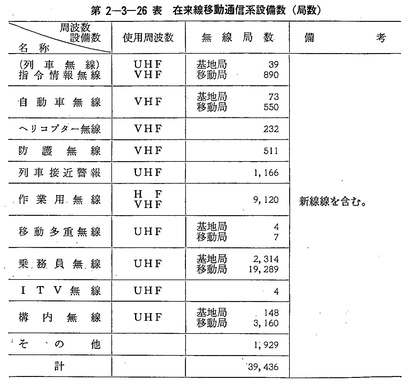 (ア)日本国有鉄道 ア.現 状 [1] 日本国有鉄道の業務と通信 日本国有鉄道(以下「国鉄」という。)では,安全迅速かつ正確に列車を運行するため,また,迅速かつ円滑な旅客サービス等の営業活動を行うために,関係者間における正確な指令伝達及び緊密な情報連絡の手段として,電気通信回線の確保は不可欠の要件となっている。 国鉄通信回線は,これらの目的のために,全国規模において整備されており,本社一鉄道管理局(30局)間等の長距離回線はSHF無線回線,鉄道管理局一鉄道管理局間等の中距離回線はSHF-UHF無線回線及び有線回線,鉄道管理局-現業機関(駅・機関区・保線区等)間の近距離回線はUHF・VHF無線回線及び有線回線で構成されている。 (イ)伝送路の構成 基本的には大容量の長距離基幹回線はSHF無線回線によって,鉄道沿線の近距離中容量回線は有線回線によって構成されるが,その伝送路の内容は次のとおりである。 A 電話回線 (A)交換電話回線 列車の運行,営業等に関する業務を遂行するため,組織内のいずれの機関とでも交換機を介して結ぶ通話に使用している。 (B)直通指令電話回線 列車の運行状況を把握し,必要な指揮命令(列車指令,旅客指令,貨物指令等)を行う際の通話等を確保するため,交換電話とは別に,指令と指令を受ける者との間を直通で結び使用している。 (C)直通区間電話回線 列車の運行状況の間合せ,応答等のため,駅相互間,電力区,通信区等の事務所相互間を直通で結び使用している。 (D)構内電話回線 駅及び操車場構内における業務連絡,一斉情報伝達等のため駅長室を中心に改札,ホーム,貨物扱所,信号扱所等相互間を結び使用している。 B 電信回線 (A)交換電信回線 列車の運行,営業等に関する情報を記録通信(印刷電信及び.模写電信)により確実に伝送するため,交換機を介して結び,各種業務連絡用として使用している。 (B)直通電信回線 駅相互間等特定の区間を結ぶ電信回線であり,次のような用途に使用している。 [1] 列車の遅延時間を駅から指令室に伝達すること。 [2] 貨物列卓の分解,組成のため,到着列車の組成内容,その後の組成予定を操車場事務室から構内関係先に一斉に伝送すること。 [3] その他図表,文書等を伝送すること。 C データ通信回線 情報を処理し,又は情報を伝送するため,データ情報の入力装置と電子計算機を結ぶ回線であり,次のような用途に使用している。 (A)列車の座席予約用として,みどりの窓口の端末装置と国立市にある中央情報処理装置間におけるデータ伝送。 (B)新幹線における設備管理,資材管理,経理事務等の集中管理用として,新幹線総局と関係機関との間におけるデータ伝送。 (C)その他,貨物列車貨車組成用,地域間急行貨物用等のデータ伝送。 (ウ)主要な無線設備 56年度末の無線局数は,4万3,942局で,使用している無線設備の概要は次のとおりであり,設備状況は,第2-3-25表,第2-3-26表及び第2-3-27表のとおりである。 A 固定業務 本社と鉄道管理局との間及び鉄道管理局相互間を結ぶSHF多重無線回線(7GHz帯及び12GHz帯)と鉄道管理局と主要駅との間及び主要駅相互間を結ぶUHF多重無線回線(400MHz帯及び2GHz帯)とがあり,指令電話,CTC(列車集中制御装置)の制御,各種データ伝送等の回線として使用している。 B 移動業務 (A)新幹線用列車無線(400MHz帯) 新幹線列車の運転に必要な運転指令,旅客営業に関する旅客指令,業務通信,公衆通信を行うため,指令所と乗務員,乗務員と駅等の関係機関,乗客と一般加入電話との間を結び使用するものであり,新幹線の運行にとって必要不可欠のものとなっているが,東海道・山陽新 幹線は空間波方式を,東北・上越新幹線ではLCX(漏えい同軸ケーブル)方式を採用し,より安定した通信が行われることとなっている。 (B)乗務員無線(400MHz帯) 列車の運転,保安等に関する情報連絡のため,運転十と車掌との間及び乗務員と駅との間の通信に使用するものである。 (C)構内無線(400MHz帯) 操車場等において,貨物列車の貨車の分解,組成を行う際,構内作業員相互間の業務連絡に使用するものである。 (D)自動車無線(150MHz帯) 鉄道に関する事故,災害等の際,その現場から関保機関への情報連絡に使用し,通常は公安業務,保線作業等の連絡用として使用するものであり,交換電話にも接続することができる。 (E)防護無線(150MHz帯) 線路等に異常が発生した場合に,車上,踏切又は携帯用の装置から電波を発射し,対向,続行列車を停止させるために使用するものであり,新幹線の全線,常磐線の一部で使用している。 (F)その他 上記のほか無線設備としては,船舶無線,在来線用列車無線,公安無線,作業連絡用無線,レーダースピードメータ,列車接近警報用無線等がある。 イ.動 向 国鉄が安全で円滑な輸送業務を遂行する上で,電気通信の果たす役割は大きく,特に最近における列車ダイヤの過密化,列車の高速化に伴り,列車集中制御,電力系統の集中管理等,電子計算機による情報処理及びこれに基づく制御の自動化等が逐次進行しているが,今後はデータ通信の需要が増大し,通信回線に対する期待が高まるとともに,その信頼度の向上が
